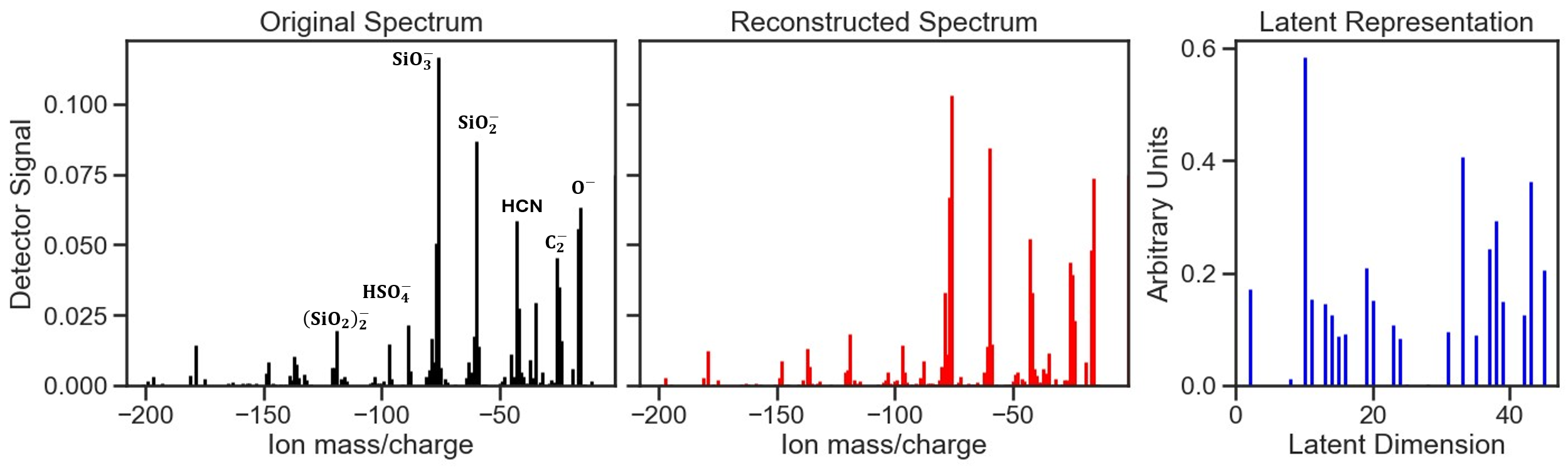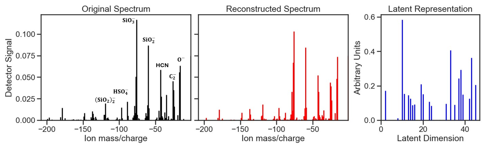 Figure 4Example of spectral reconstruction and feature compression by the Stacked Autoencoder (SAE). Panels illustrate a representative Moroccan soil-dust aerosol negative polarity spectrum (left), its reconstructed spectrum generated by the trained Stacked Autoencoder (middle), and the corresponding latent representation vector in the reduced-dimensional space (right). The original and reconstructed spectra display strong alignment indicating effective preservation of chemically relevant structure. The reconstruction error (sum of squares) for this sample is 0.09. The latent vector encodes 48 features capturing dominant compositional patterns used for downstream classification. All intensities are arbitrarily normalized for visualization, with y axes representing normalized ion signal strength and x axes denoting m/z (negative-ion mode).
