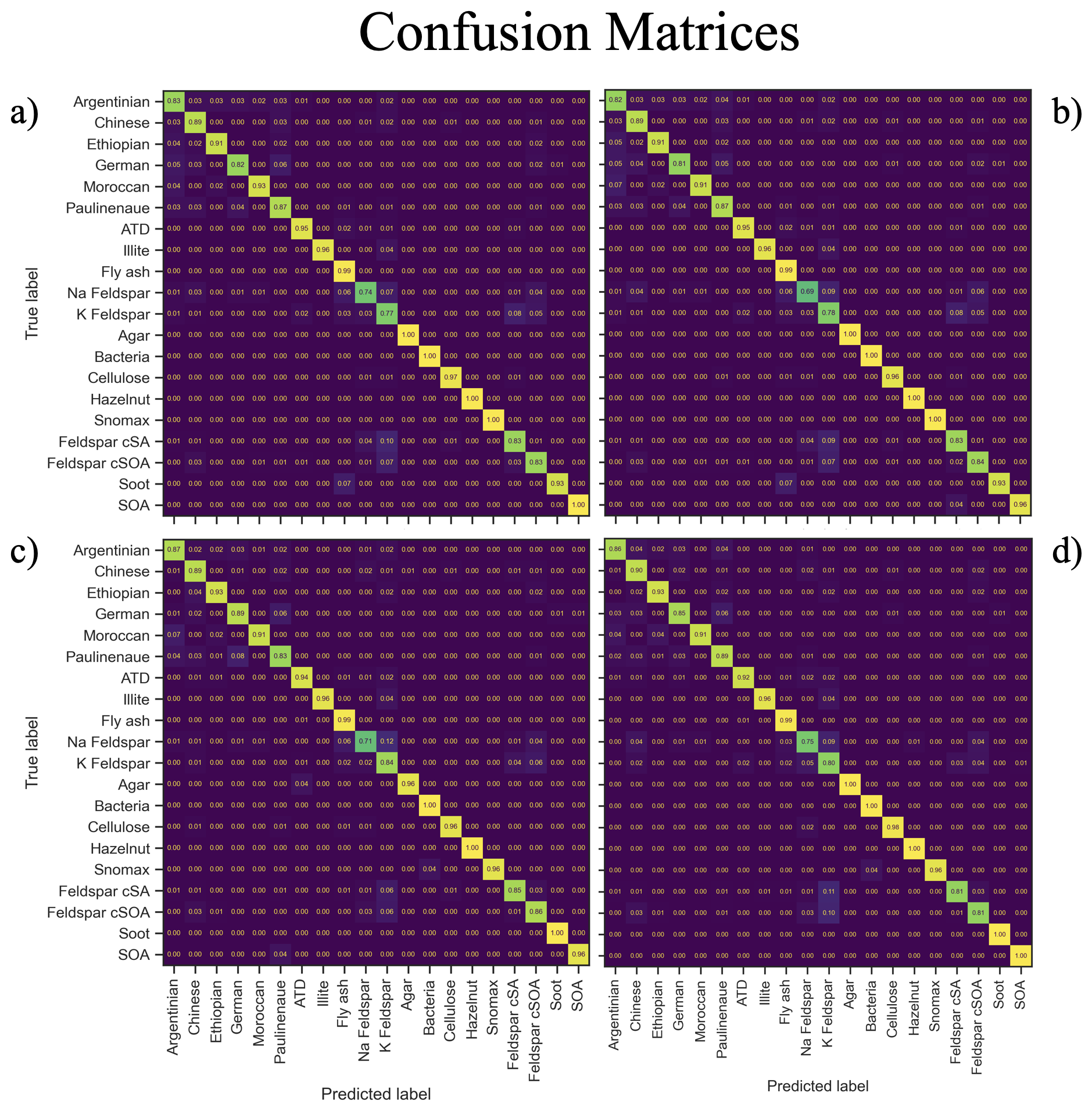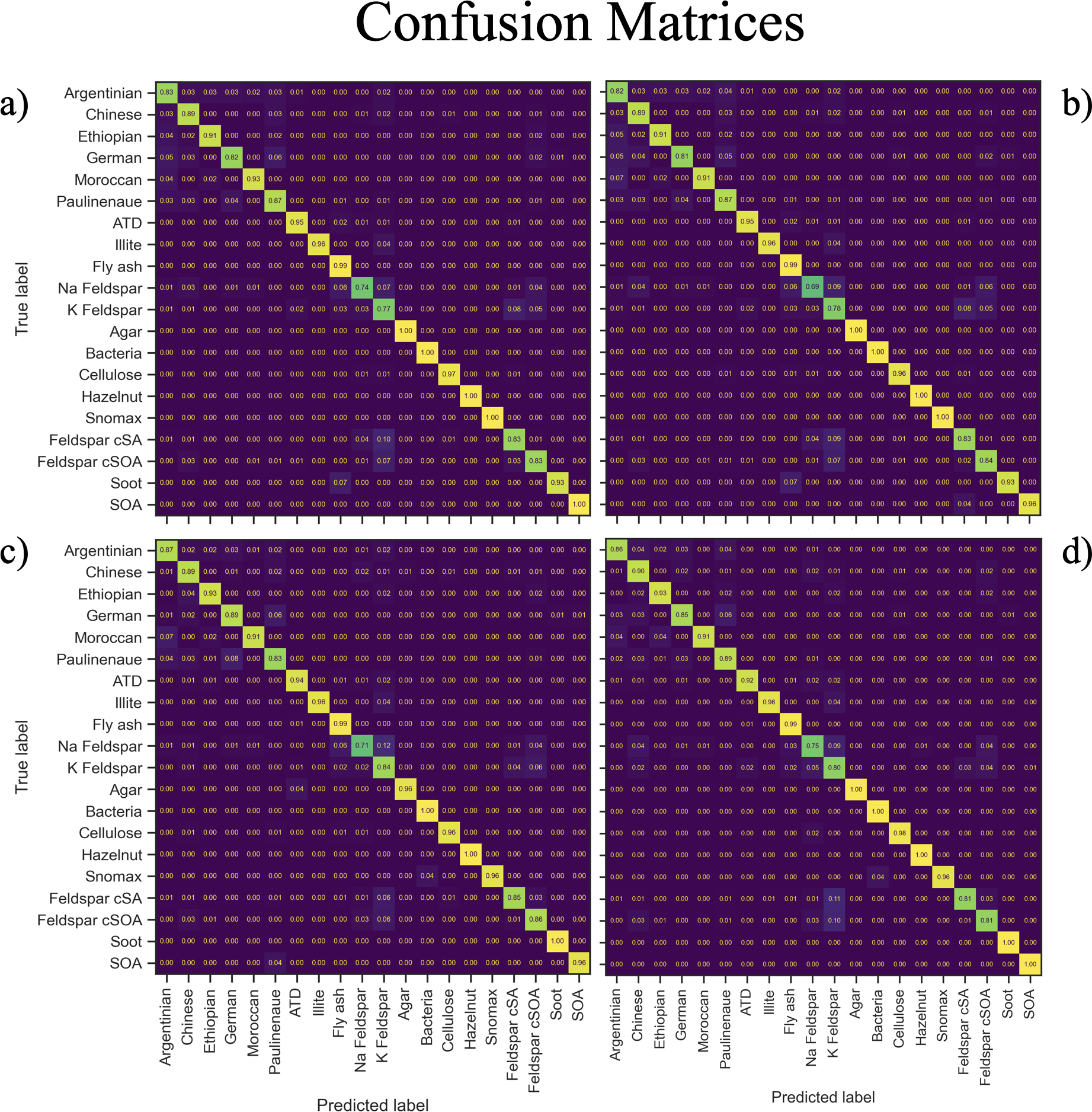 Figure 5Confusion matrices illustrating classification performance across the 20 aerosol classes for each model. (a) Standard Support Vector Machine (SVM) classifier, (b) Self-Training SVM classifier, (c) Stacked Autoencoder classifier, and (d) Mean Teacher–trained Stacked Autoencoder classifier. Diagonal elements represent correctly classified samples, while off-diagonal elements indicate misclassifications. Color intensity corresponds to normalized prediction frequency within each true class.