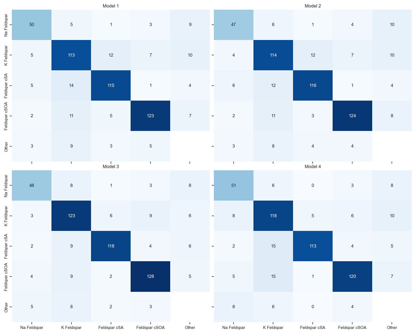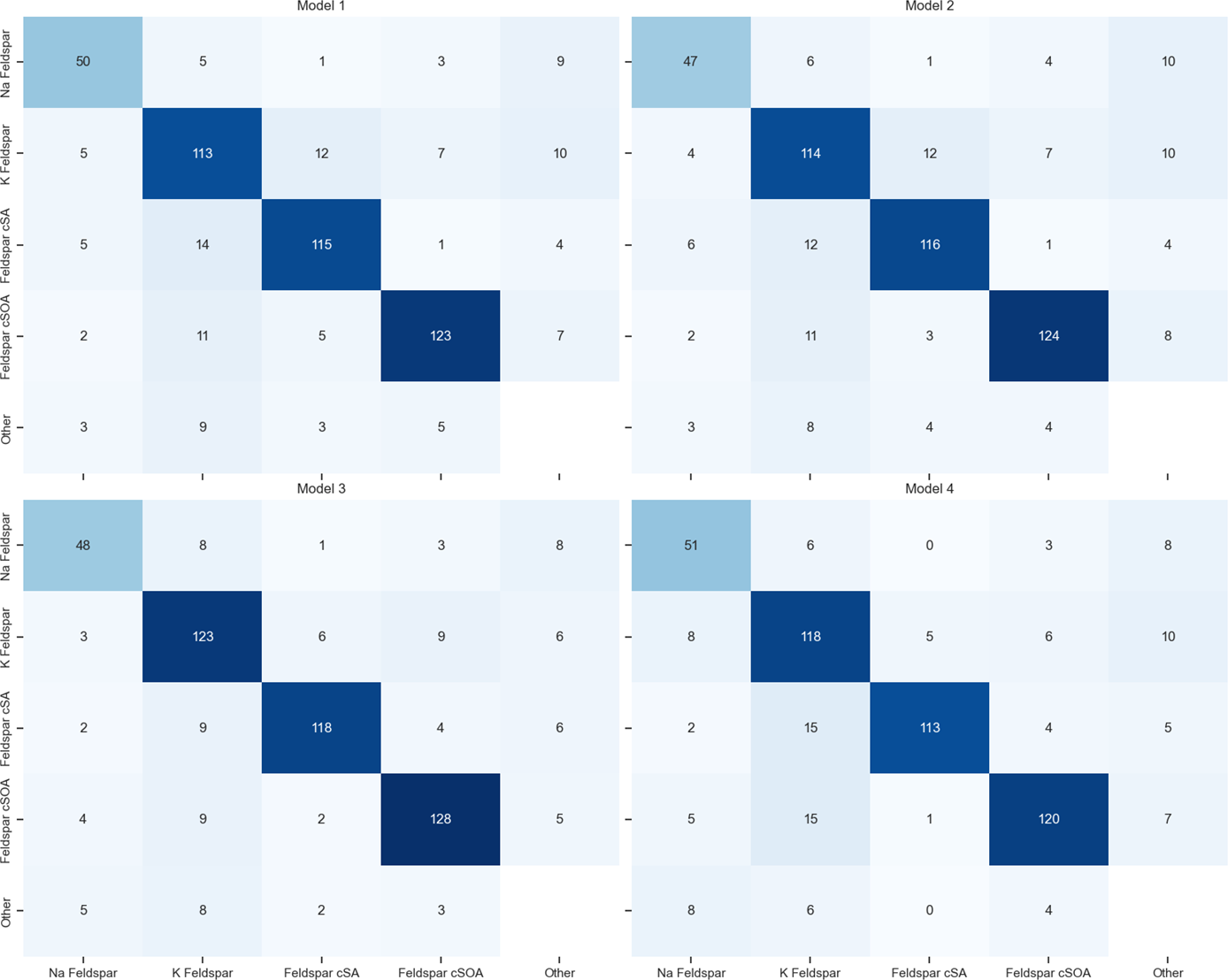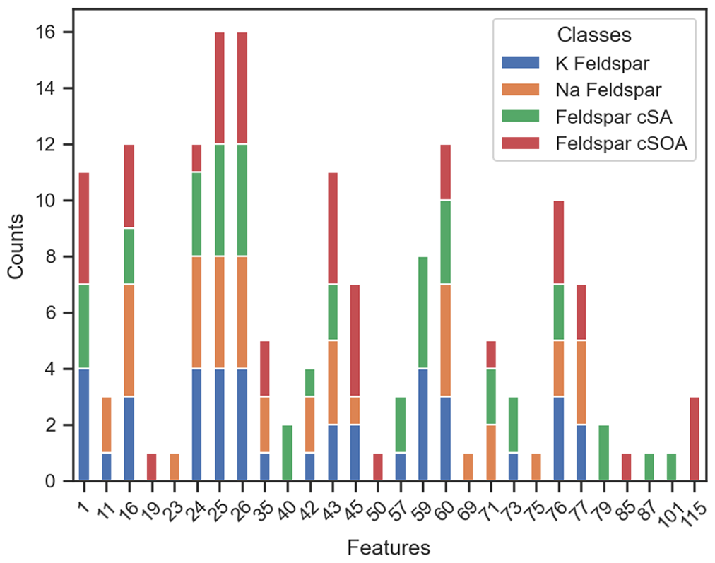 The classification of feldspar species presents unique challenges due to their overlapping mass spectral characteristics. To identify which ions contribute most strongly to feldspar discrimination across all four classification frameworks, we analyzed feature importance rankings systematically. For each model and each of the four feldspar species (K-feldspar, Na-feldspar, Feldspar cSA, Feldspar cSOA), the top 10 most influential features were extracted based on permutation importance scores. We then counted how many times each ion appeared in these top-10 lists across all models for each feldspar species (Fig. 8). Because each feldspar species contributes rankings from four models, a given ion can appear up to 4 times per species. This results in a maximum possible count of 16 for any single ion across all four feldspar classes (4 models × 4 species). This aggregation highlights which ions consistently emerge as key discriminators across different model architectures.