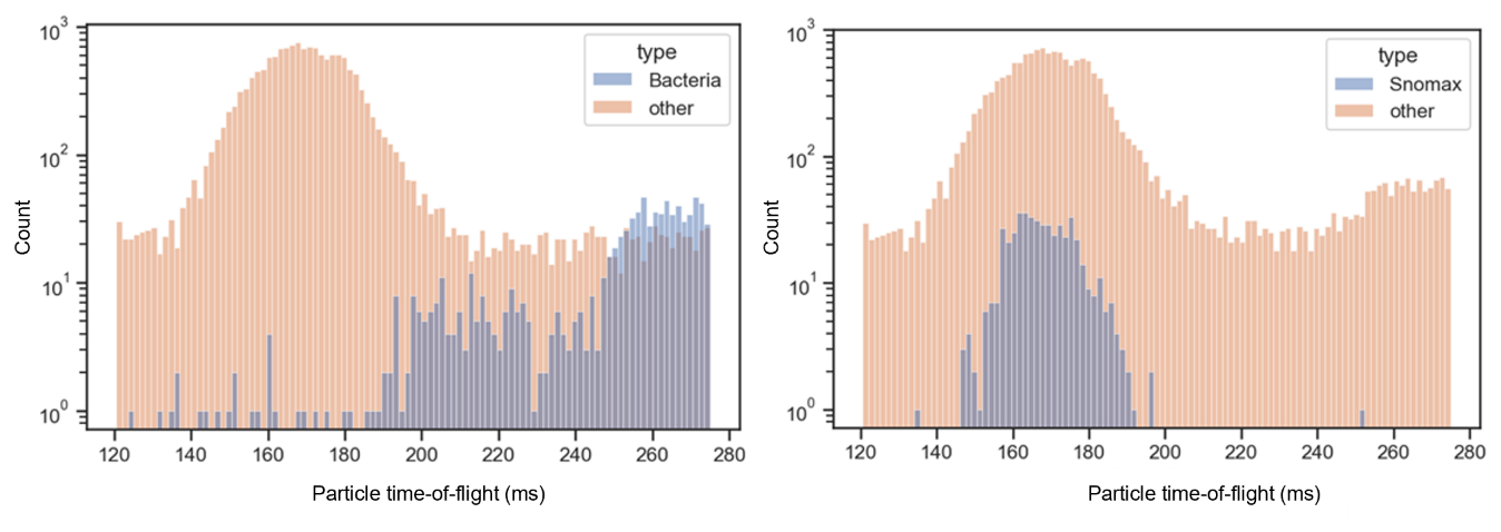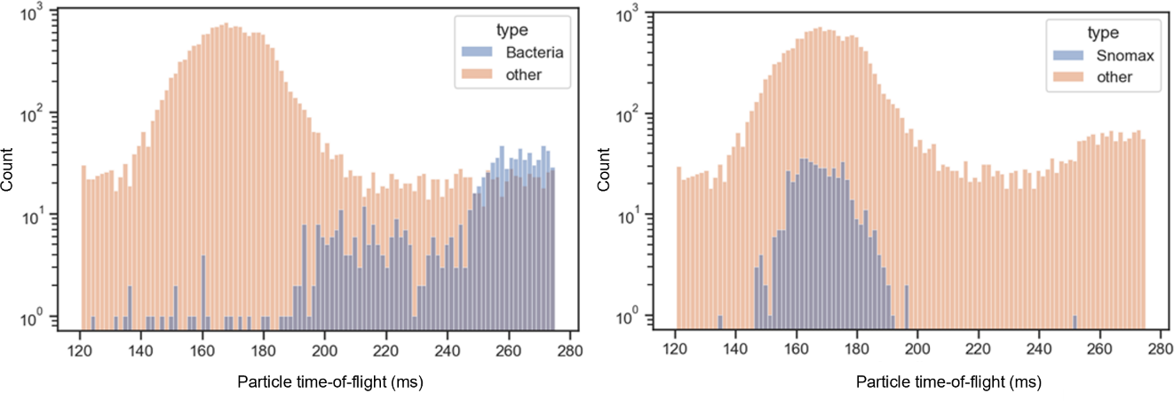 Figure 7Particle size distributions (time-of-flight) for Bacteria and Snomax classes relative to the rest of the labeled dataset. Histograms show the particle time-of-flight (ms) distributions, used as a proxy for vacuum aerodynamic diameter, comparing (left) Bacteria and (right) Snomax particles (blue) against all other particle types (orange). Both classes display distinct modal peaks in their time-of-flight distributions, indicative of characteristic aerodynamic size ranges that differ from the broader distribution of other aerosol types. Bacteria exhibit longer flight times (typically >230 ms), corresponding to larger effective diameters, while Snomax shows a narrower mode near 170 ms, consistent with smaller, more uniform particle sizes.
