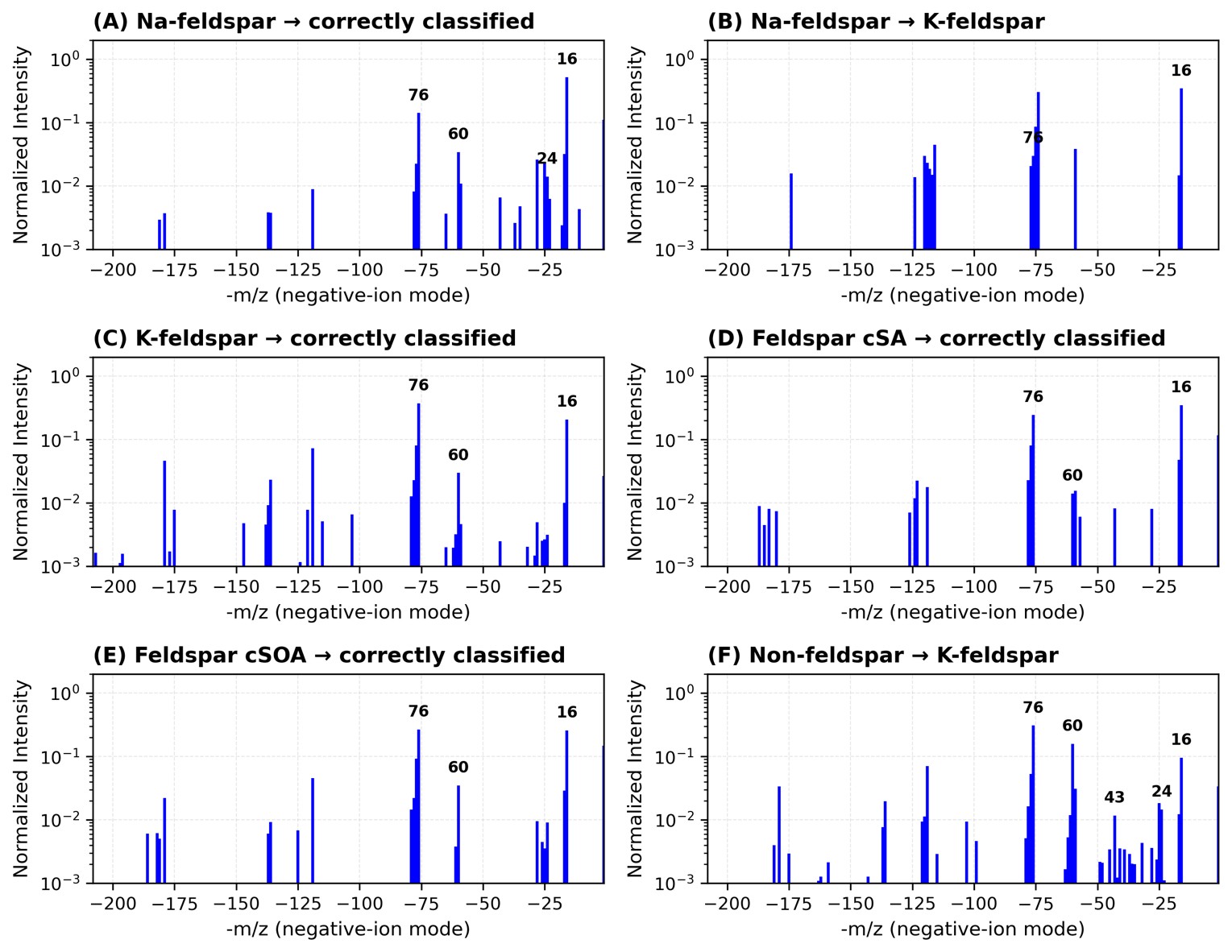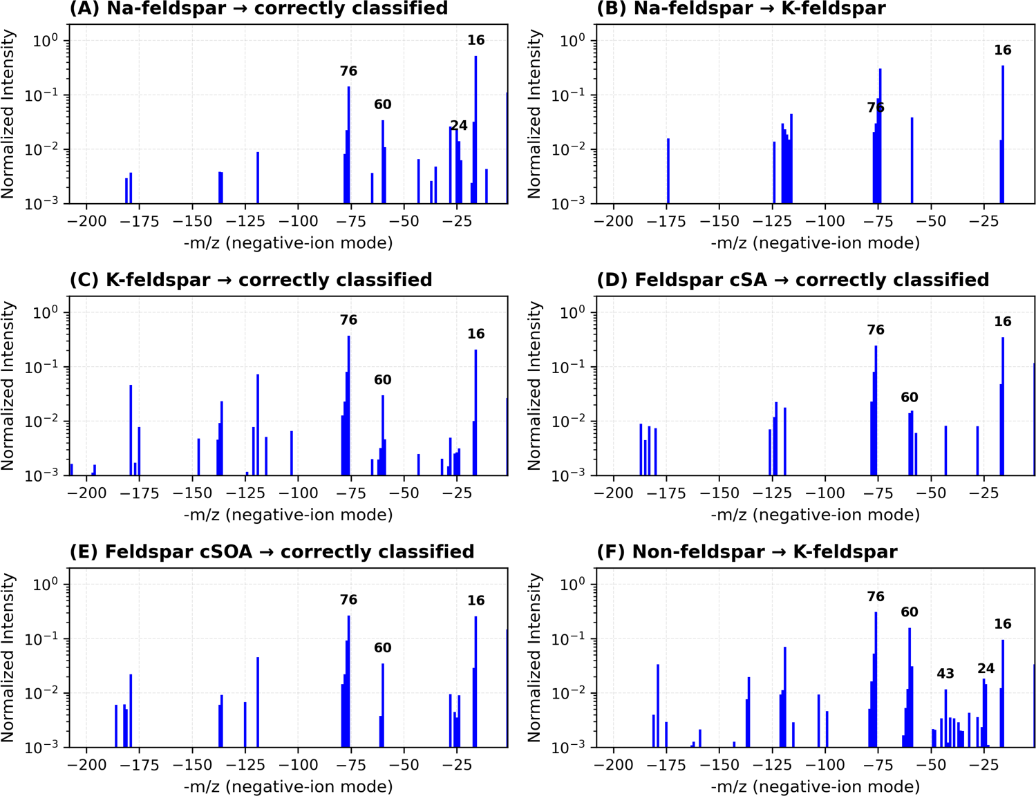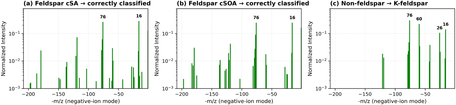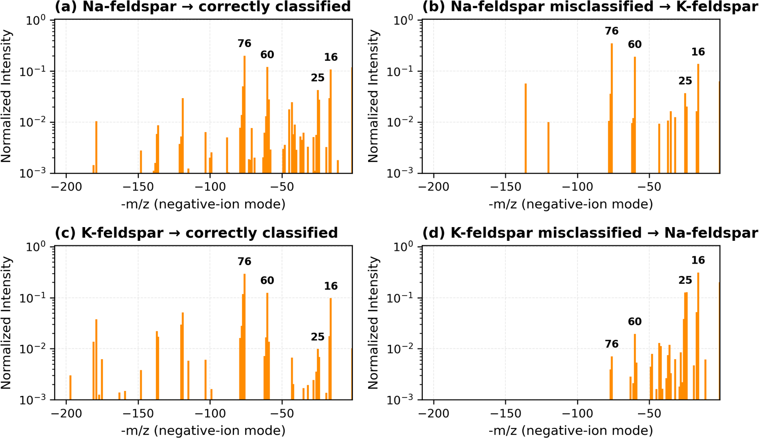 Figure A6Additional Na- and K-feldspar spectra illustrating characteristic misclassifications across independent model seeds and architectures. Each spectrum is normalized with influential ions (16, 60, 25, and 76 m/z) annotated.
