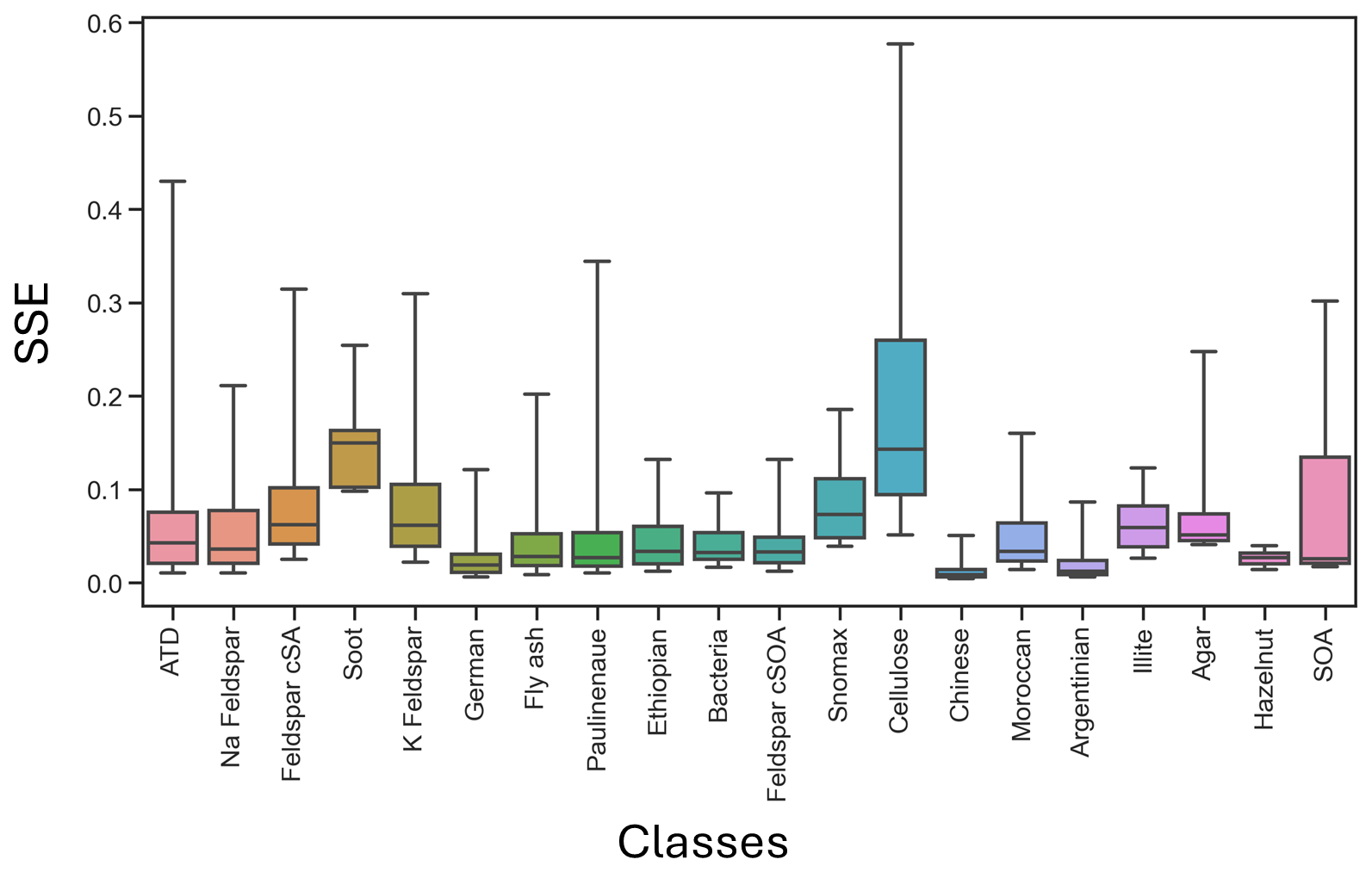 No statistically significant correlation (R2< 0.1) was observed between reconstruction error and F1-score, indicating that reconstruction fidelity is not a proxy for classification performance within this dataset. For example, despite their high reconstruction errors, classes like Soot achieved high precision and recall scores, while Chinese and Argentinian samples with very low reconstruction errors showed sub-par classification performance. The distribution of SSE scores per class is included in the appendix (Fig. A2).