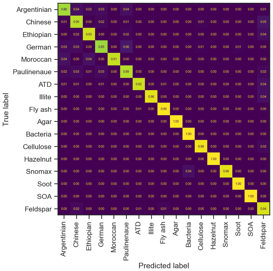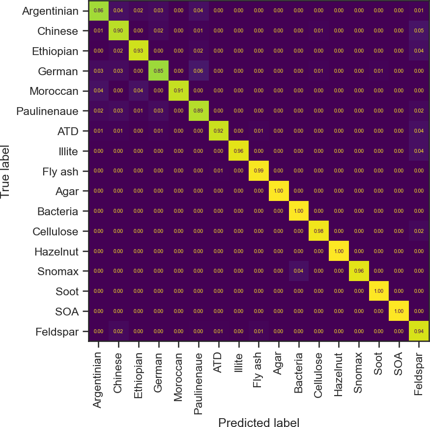 The models achieved overall accuracies of 90.0 %–91.1 %, representing robust performance for a challenging 20-class classification task characterized by severe class imbalance (e.g., Soot and Hazelnut as rare classes) and high spectral overlap between aerosol types (e.g., Feldspar species). This performance surpasses the 87 % accuracy previously reported on this dataset (Christopoulos et al., 2018) and is competitive with 94 %–97 % accuracies achieved on simpler, 8-class aerosol problems (Wang et al., 2024c). The performance of all classifier models is listed in Table 2.