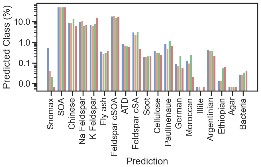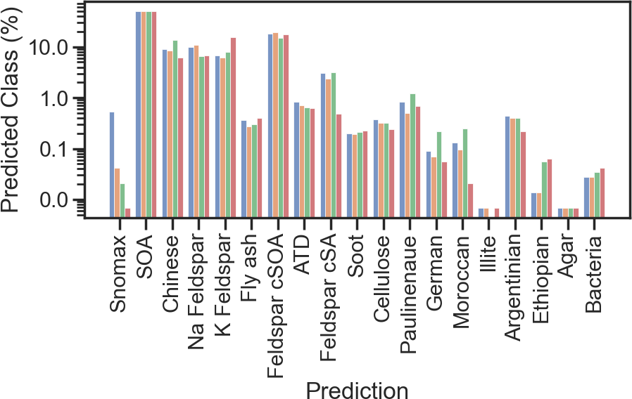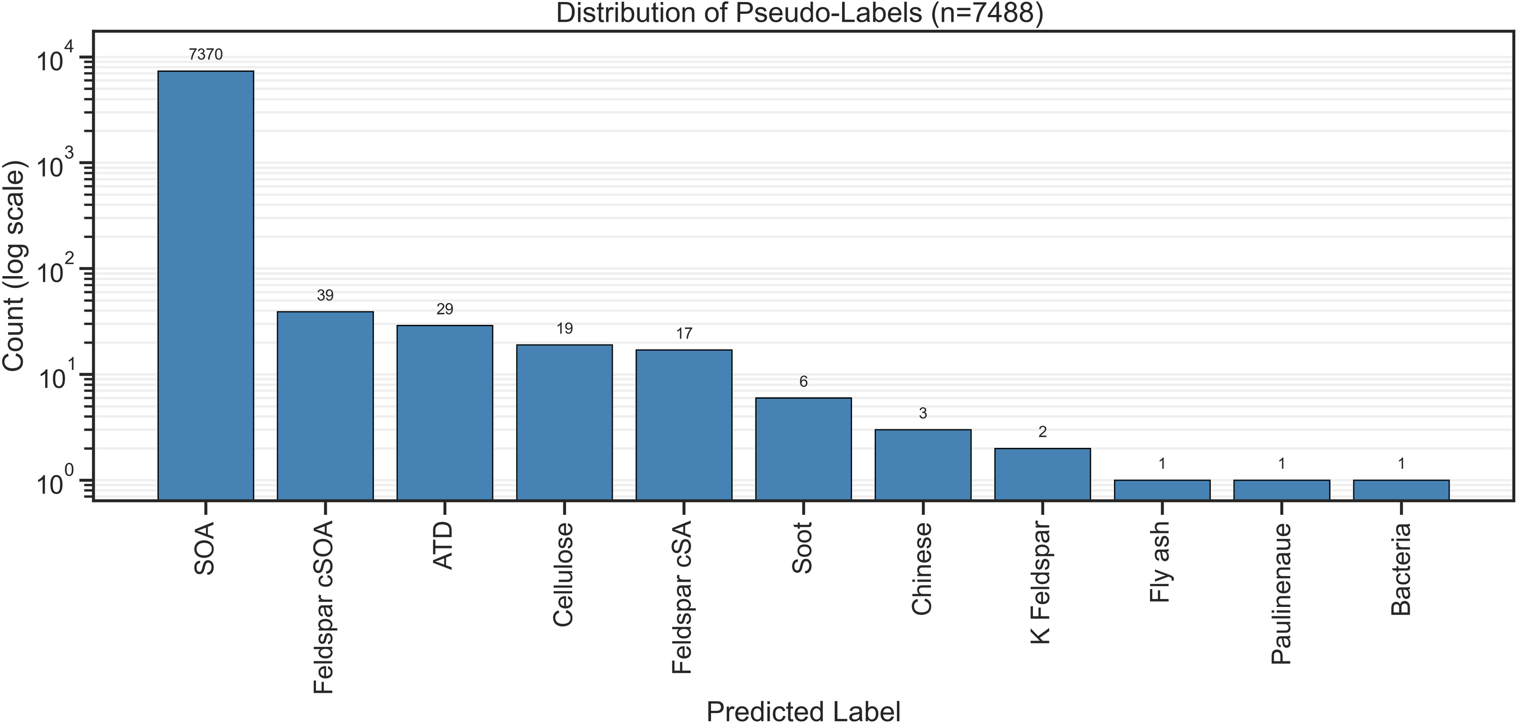 A subset of experiments was conducted as blind studies in which unknown particle mixtures (α-pinene SOA, Argentinian soil dust, and graphite soot across two distinct periods) were introduced to the APC chamber, and instrument teams analyzed the data independently without prior knowledge of chamber contents (Shen et al., 2024). These blind experiments yielded 14 478 unlabeled mass spectra that follow identical formatting and preprocessing steps as the labeled data but lack definitive aerosol type assignments. This unlabeled portion serves as training data for semi-supervised learning. The unlabeled dataset comprised 14 478 single-particle spectra collected under the same acquisition parameters as the labeled reference set. The chemical composition of this unlabeled pool is unknown a priori. For transparency, we applied all four models to the unlabeled spectra to obtain the percentage of spectra assigned to a given class (Fig. A4). The distribution of labels on this subset are reported only for diagnostic purposes and were not used as ground truth in model training.