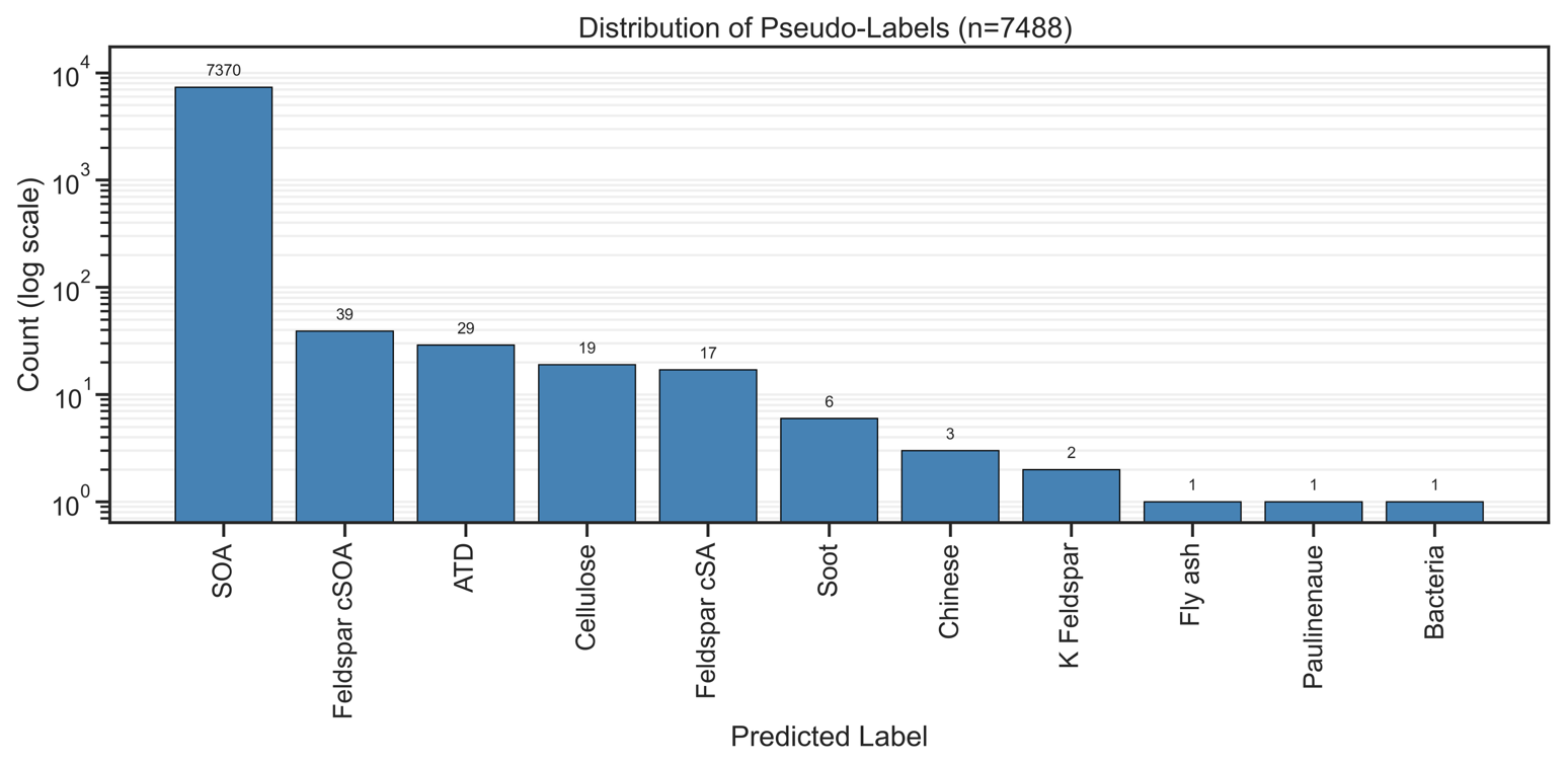 Figure A5Pseudo-labeled spectra admitted at threshold = 0.95 during the self-training SVM (Model 2). 7488 unlabeled spectra (51 % of the unlabeled pool) were admitted as pseudo-labeled samples after meeting the 0.95 confidence threshold over 16 iterations.