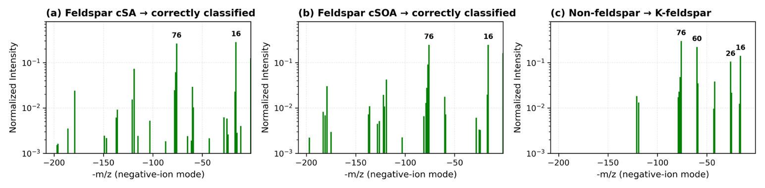 Figure A7Supplemental coated-feldspar (cSA, cSOA) and non-feldspar misclassification examples complementing. A slight difference between compositional features responsible for improved precision in coated feldspar identification is observed, while the final panel shows spectral overlap causing occasional non-feldspar  K-feldspar errors. For example, the missing 60 m/z peak.