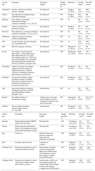 The dataset analyzed in this study was collected using the Particle Analysis by Laser Mass Spectrometry (PALMS) instrument during the Fifth Ice Nucleation workshop (FIN-1) (Shen et al., 2024) at the Karlsruhe Institute of Technology's (KIT) Aerosol Interactions and Dynamics in the Atmosphere (AIDA) facility, with additional samples acquired at MIT's Aerosol and Cloud Laboratory (Christopoulos et al., 2018). Aerosols were generated through prescribed techniques in KIT's 84 m3 AIDA chamber and 3.7 m3 APC chamber: minerals and dusts via rotating brush dispersion, soot via propane combustion or graphite spark generation, α-pinene SOA via in situ ozonolysis, bioaerosol (Snomax) via atomization, and internally mixed particles via SOA condensation onto minerals (Shen et al., 2024).