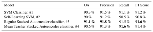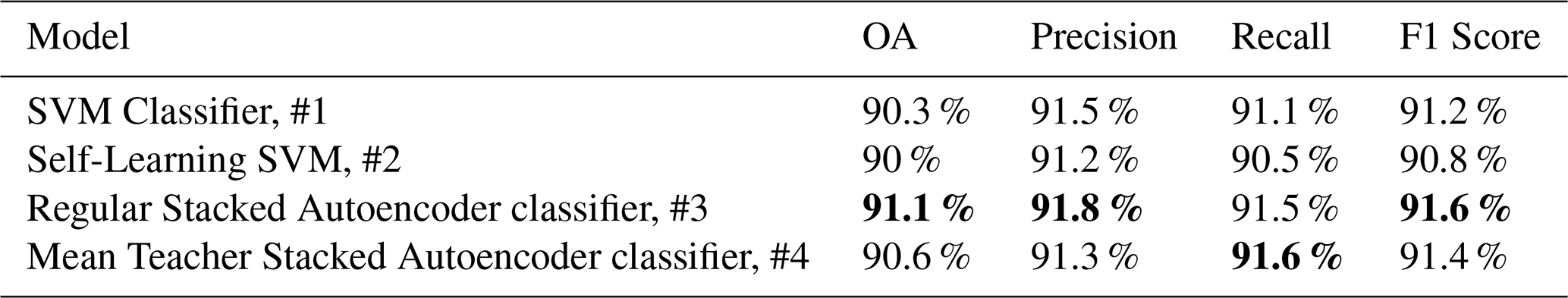 Table 2Performance metrics of each model in this study. Left to right: Overall accuracy (OA), Precision, Recall, and F1-Score. Performance metrics of the four classification models evaluated in this study. Reported values represent overall accuracy (OA), precision, recall, and F1 score (%) for each approach. Bold values denote the highest performance per metric. The Regular Stacked Autoencoder (Model 3) achieved the best overall balance of precision and recall, while the Mean Teacher variant (Model 4) exhibited comparable recall and F1 scores.
