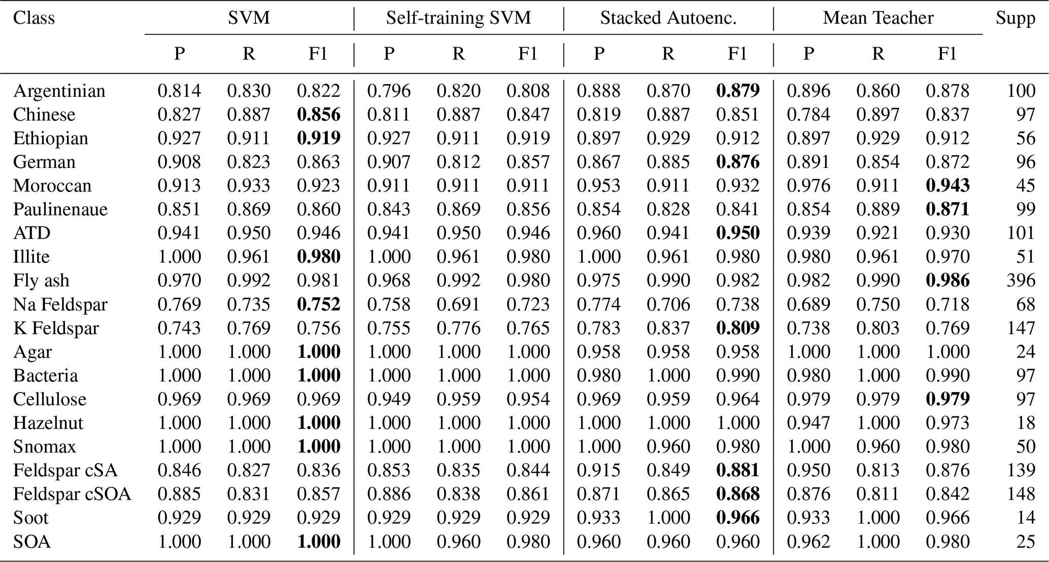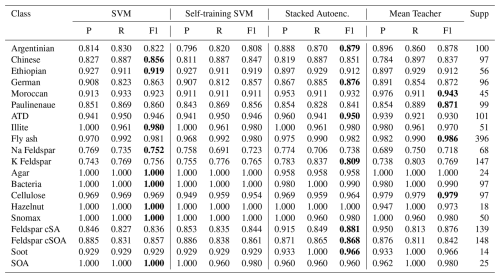 The stacked autoencoder classifier (Model 3) performed best at 91.1 % overall accuracy, 91.8 % precision and 91.6 % F1-score. Model 1 achieved an F1 score of 91.2 % but during parameter optimization most iterations yielded a score below 89.5 %. The performance of each model in each class can be seen in the confusion matrix in Fig. 5. Certain misclassifications were not random but reflected underlying chemical overlap among particle classes. For example, K-Feldspar and Na-Feldspar spectra were frequently assigned to other mineral or metallic types. This ambiguity is consistent with shared ion signatures (see Table A1 for a reference guide to ion identities): feldspar and dust both exhibit strong signals at m/z 16 (O), m/z 24 (C2-), and m/z 60 (SiO2-). Similarly, bacterial and Snomax particles showed overlapping assignments, attributable to common peaks such as m/z 26 (CN) and m/z 43 (C2HO) (Table A1). These confusions reproduce the challenges faced by manual SPMS classification, thereby reinforcing the models' ability to capture genuine ambiguities inherent in atmospheric particle spectra. Including the unlabeled data in a semi-supervised fashion for the SVM model showed a slight decrease in performance (Model 2), despite the increase in overall training data. The calibration procedure for the self-learning SVM, as discussed in Sect. 2, demonstrated difficulty in using most of the unlabeled data to increase classification accuracy.