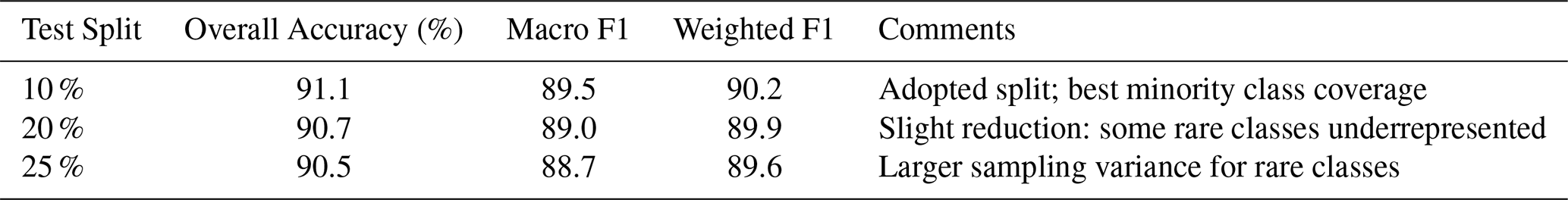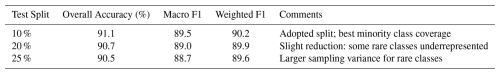 All four classification models explored in this study were trained and tested on this labeled dataset with identical train-test partitions (90 % training, 10 % testing). The distinction between supervised, unsupervised, and semi-supervised learning is the use of the unlabeled dataset, which unlike the labeled dataset, does not need to be split. For different sizes of the test split, we observed minor impact on the results (Table A3). Specifically, overall accuracy decreased only marginally from 91.1 % (10 % test) to 90.7 % (20 %) and 90.5 % (25 %), while macro F1 and weighted F1 varied by less than 1 % (89.5 89.0 88.7 and 90.2 89.9 89.6, respectively). The chosen 90/10 split offers the best balance between stable model evaluation and adequate representation of minority aerosol classes. Larger test proportions (20 %–25 %) reduced the number of spectra available for rare categories such as soot, agar, and hazelnut pollen, leading to increased sampling variance and lower class-level precision. While individual class metrics showed variations for different test sizes, the overall performance measures (accuracy, precision, recall, F1-score) remained stable. Metrics for classes with very limited samples (particularly soot, hazelnut pollen, and agar) should be interpreted with appropriate caution due to their small test set representations. All scripts for preprocessing, model training, and evaluation have been archived and are publicly available at GitHub.