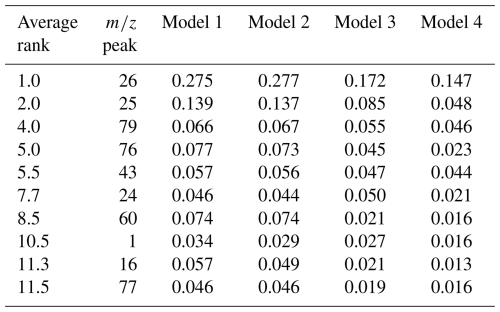 Permutation feature importance analysis is employed to understand model decision-making. This involves shuffling feature values randomly and measuring the resulting decrease in F1 score. Comparing feature importance across models and classes, as will be done in Sect. 3.3, reveals the most influential mass spectral features for each aerosol type. Those mass peaks consistently ranked among the ten most influential across all model architectures are shown in Table A5. Furthermore, the area under the precision-recall curve (AUC-PR) aids in assessing how well models distinguish between class pairs, especially useful for imbalanced classes. Class-specific precision, recall and F1-scores are available in the appendix in Table A2.