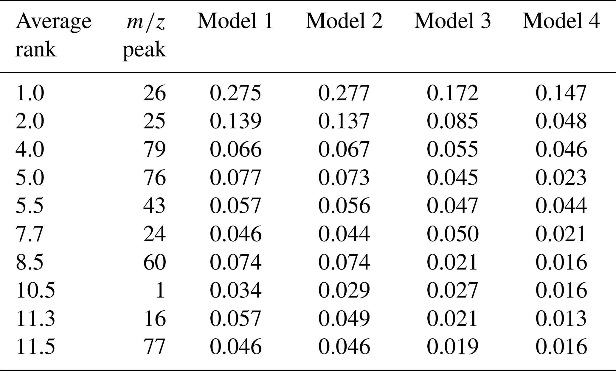 Table A4Top ten ions, ranked by their average rank across the four classification frameworks. Feature importance for each model was determined using permutation importance, via the drop in the macro-averaged F1 score when a single m/z feature's values are randomly permuted. The reported importance values are the average of 10 independent repeats.