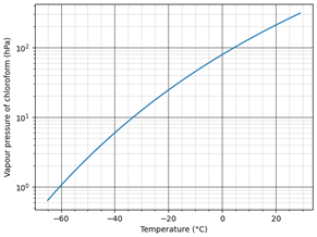 Figure 1Vapour pressure of chloroform (hPa) vs. temperature (°C) adapted from Linstrom and Mallard (2026).