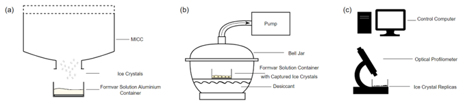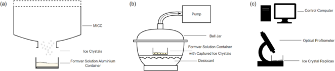 Before the experiment, the bell jar was placed within the outer room of the cloud chamber at −20 °C, and the pressure later reduced at this temperature to encourage the formvar to solidify. Once the replicas were formed and hardened, they were brought to room temperature to allow ice particles to melt. After that, the samples were immediately taken for imaging to ensure that the crystal replicas remained intact with no deformation over time.