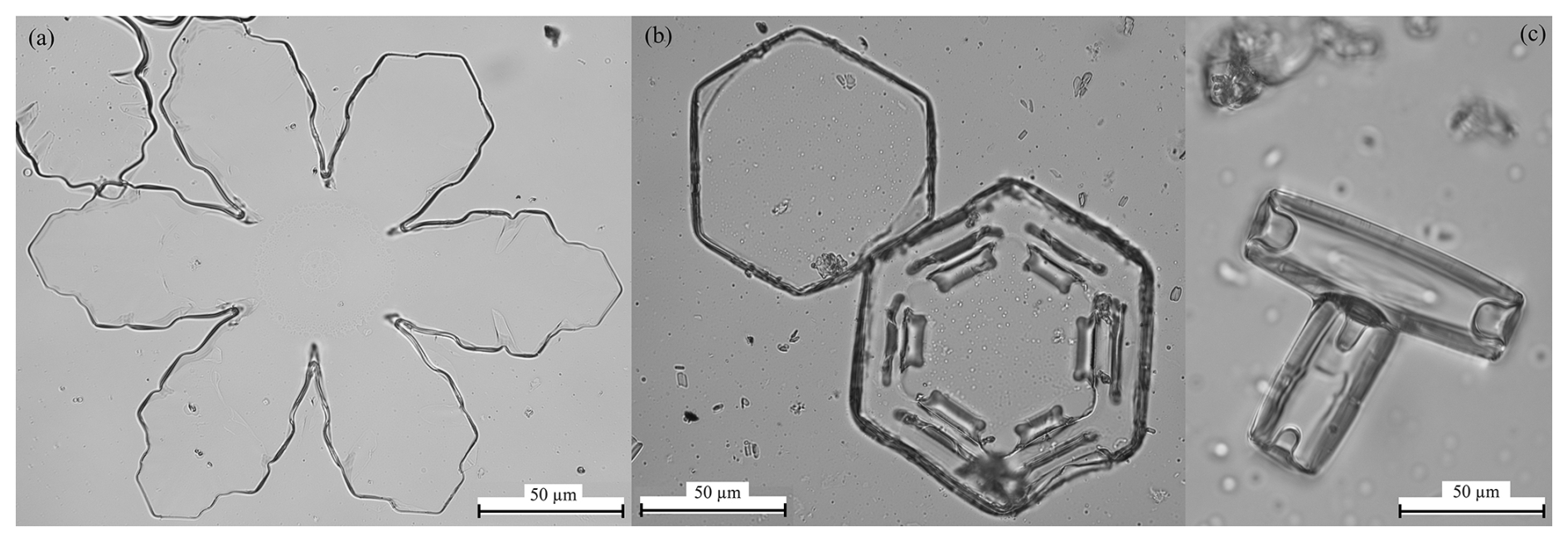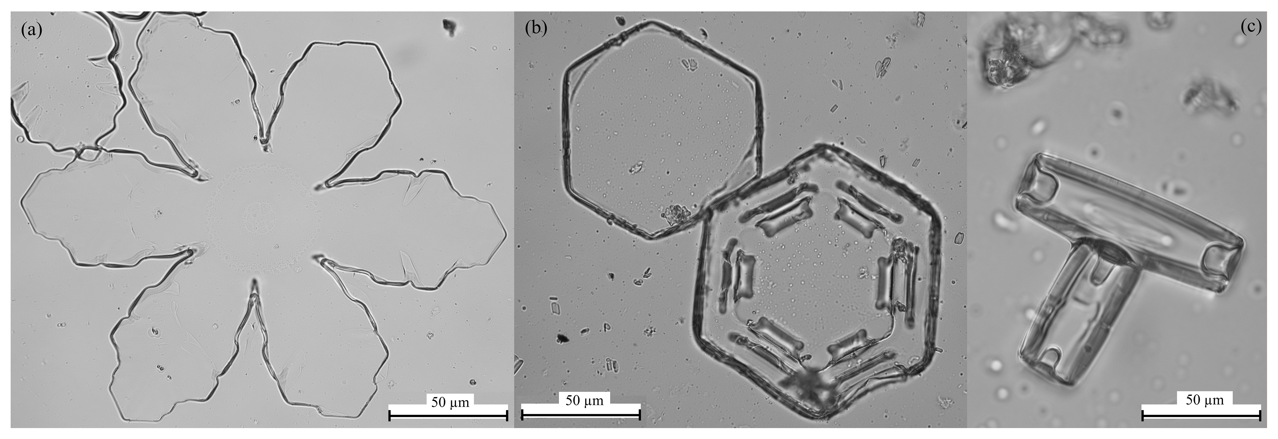 Figure 3Optical microscope images of formvar replicas of random crystals with a shape of: (a) stellar plate, (b) hexagon and (c) column.