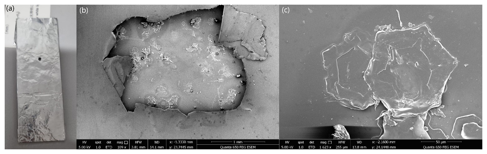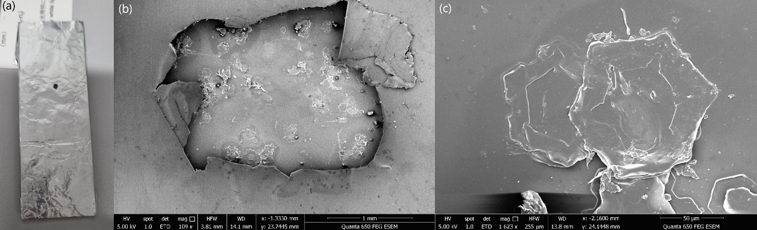 Figure 4SEM imaging steps described: (a) sample 73 covered with foil with an opening in it, (b) the selected area's SEM image and (c) close-up image of two hexagonal plates that overlap.
