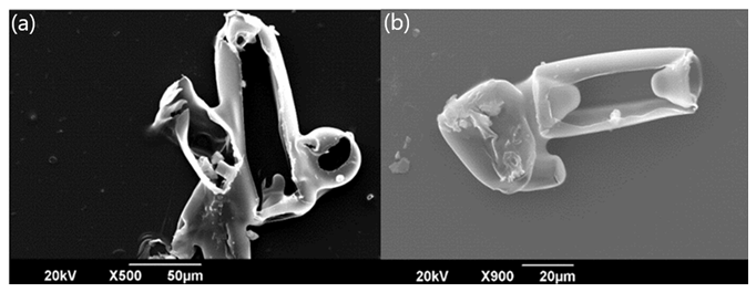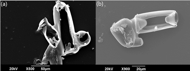 In total, eight samples were prepared for this preliminary investigation, and were imaged with varying zoom scales during three different SEM sessions. It was observed that a significant portion of the features are artefacts of the formvar process (Fig. 5). That is the crystals did not form complete 3-dimensional replicas. One reason for this was considered to be the thin layer of formvar delivered by brushing it onto the slide, so there was insufficient depth for the crystals to be fully covered, or the crystal morphology prevented it sinking sufficiently for full cover. Finally, we had to consider whether the formvar material might start to deform after or whilst the ice crystals evaporated. A relatively simple workaround for many of these problems was to increase the depth of the formvar solution layer by constructing a container to enable a pool of formvar to cover the slide, deep enough to capture the majority of single crystals, though this has consequences in terms of the evaporation rate.