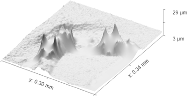 Figure 6Surface scanning, using an optical profilometer, of a replica of salt crystal created by using brush technique. The image reveals incomplete or distorted surface details due to limitations of the brush technique, which failed to capture fine structural features accurately. This led to the refinement of the replication method.