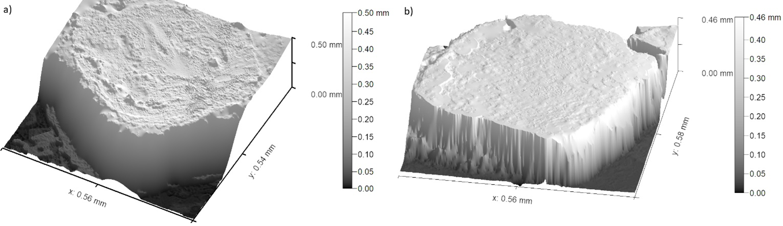 Figure 7(a) Scan of a randomly chosen salt crystal without formvar solution application. (b) Scan of a randomly chosen formvar shell after salt crystal removal. Both were taken with an optical profilometer.