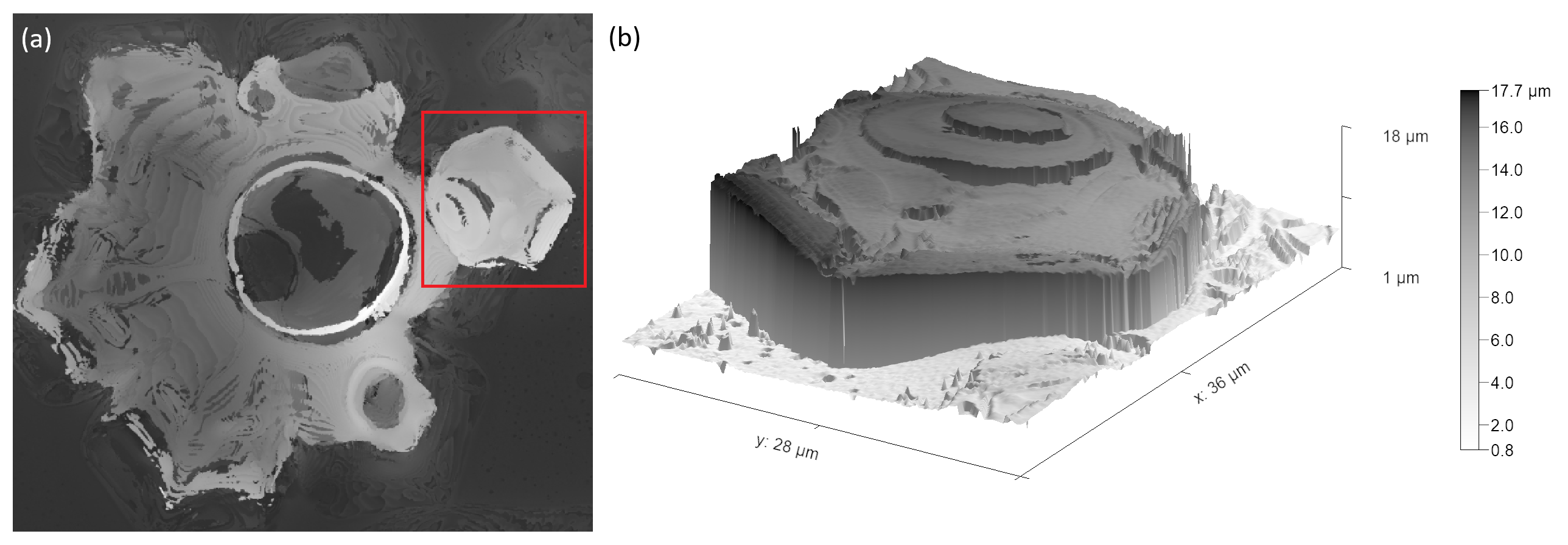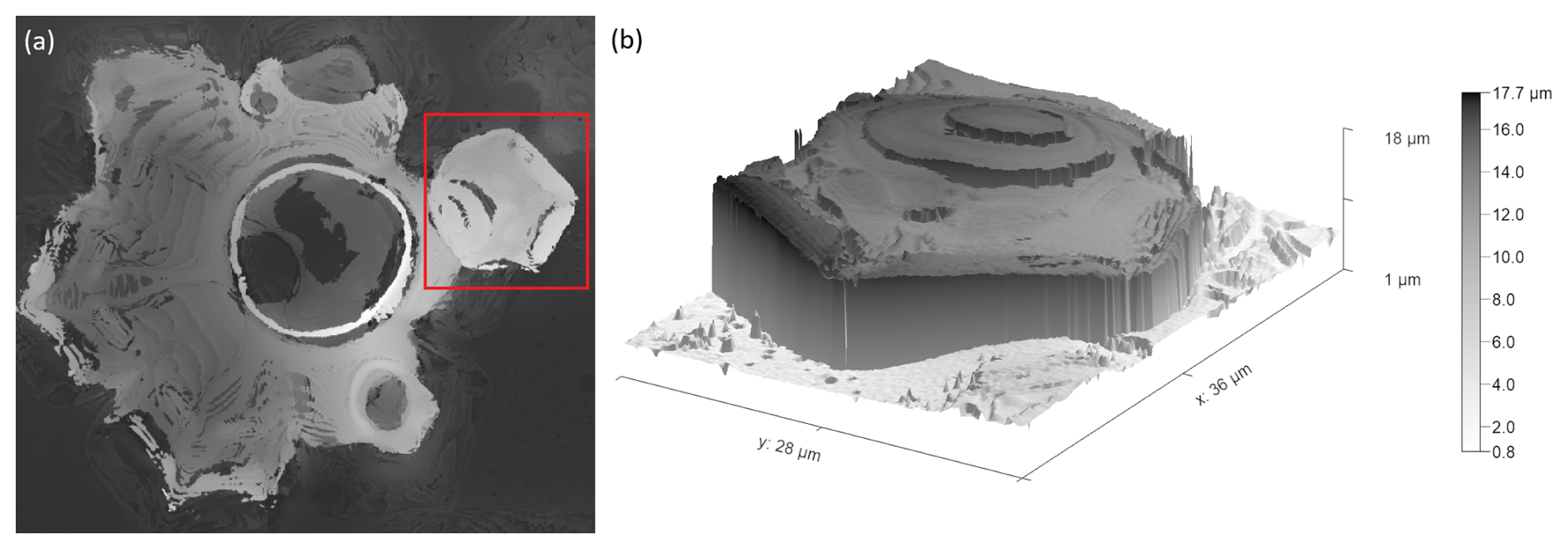 Figure 8(a) One plate sits on another crystal marked with a red square. (b) Detail of surface scan of crystal highlighted by red square. Both scans were taken with an optical profilometer.