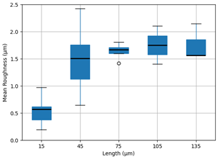 Figure 9Statistical comparison of length (µm) vs. mean-roughness values (µm) across multiple selected areas of multiple ice crystals' surfaces (n = 7 for each size bin). Circle indicates outlier.