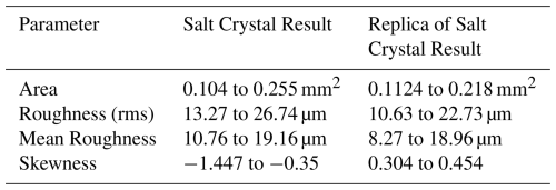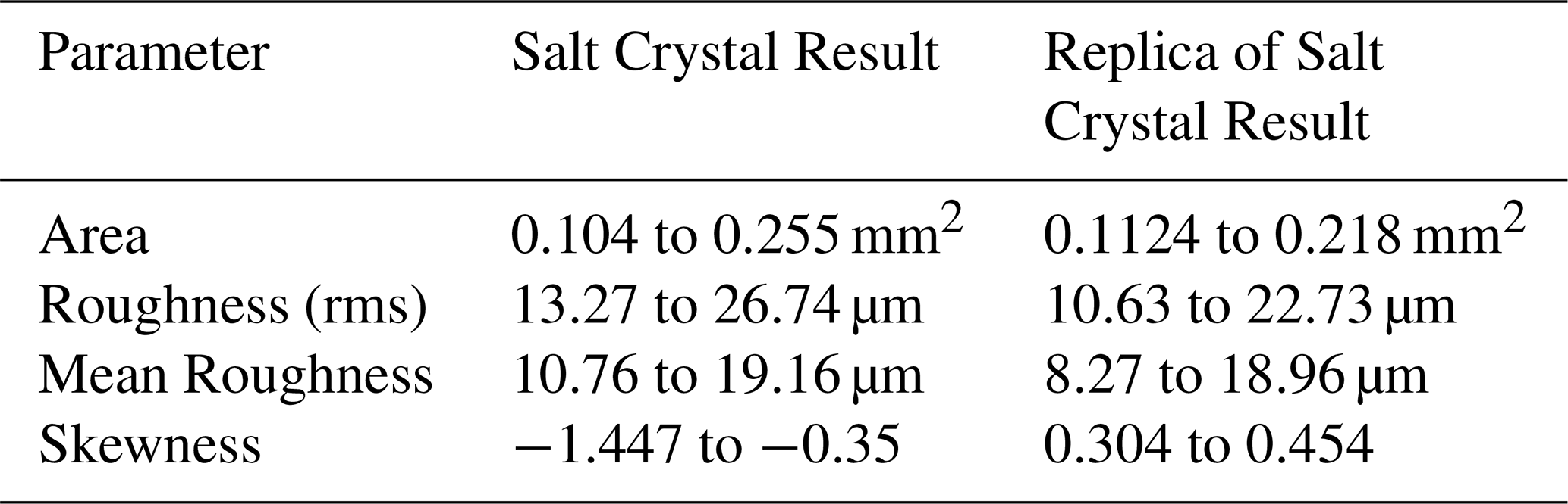 Table 1One-dimensional roughness parameters of four salt crystals and four salt crystal replica samples.