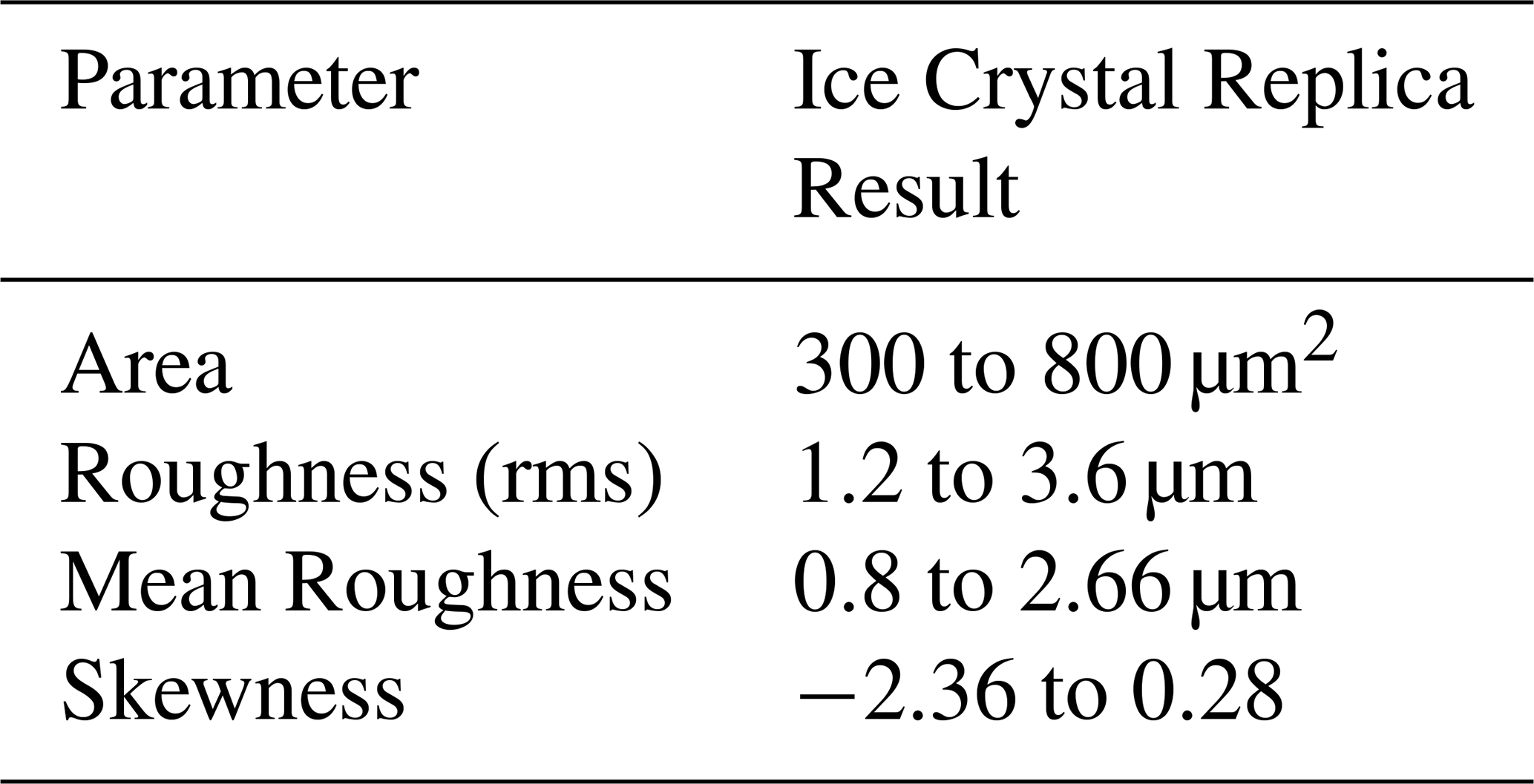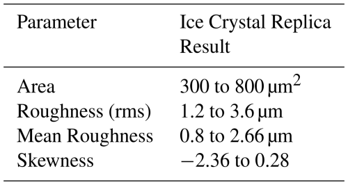 An example crystal replica is shown in Fig. 8, visually demonstrating that it is possible to capture the detailed surface features and shape of ice crystals with formvar. Multiple ice crystals were analysed using the same software, Gwyddion, to calculate roughness parameters and ascertain a range for the different variables. These results are shown in Table 2.