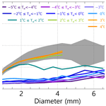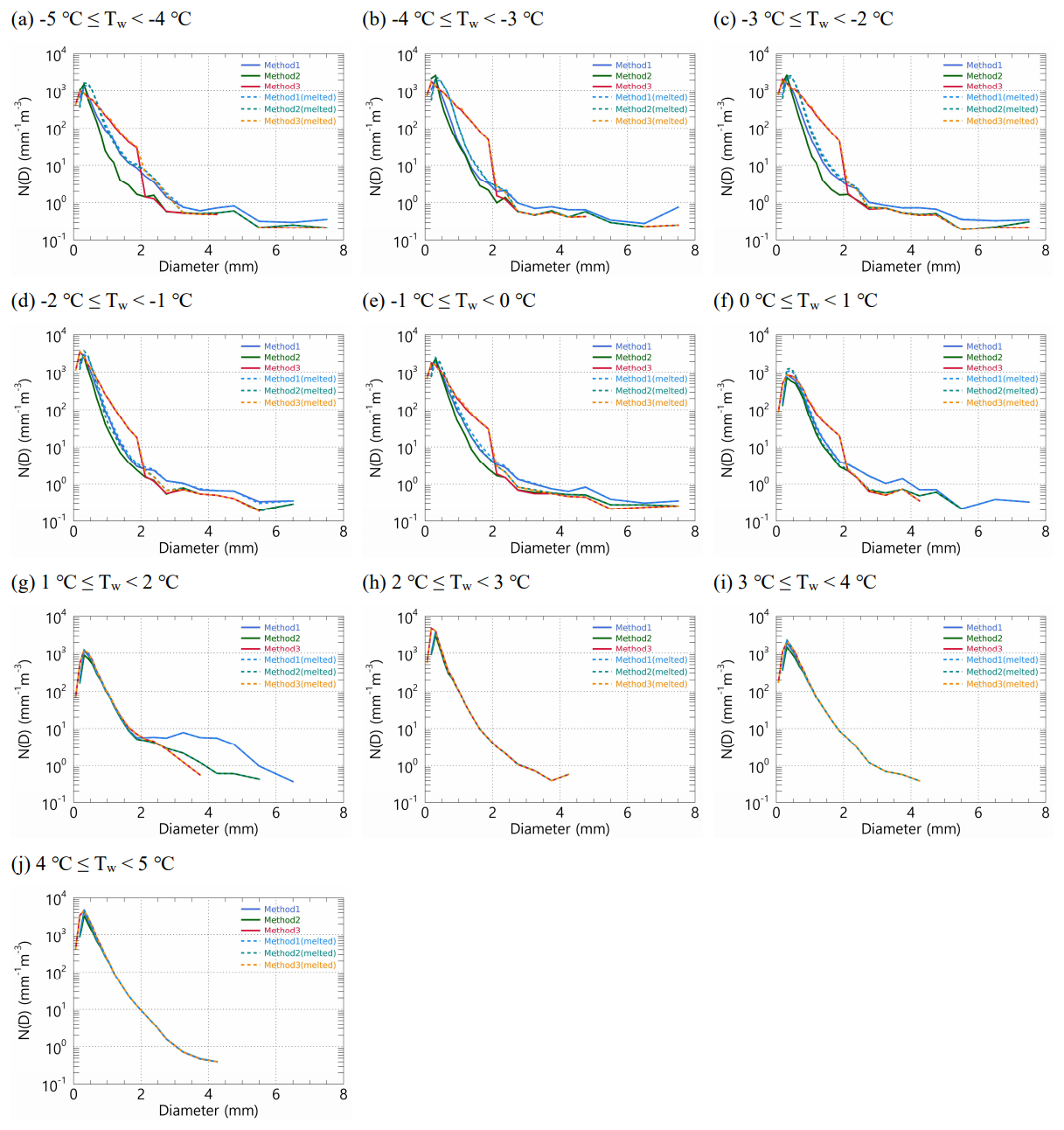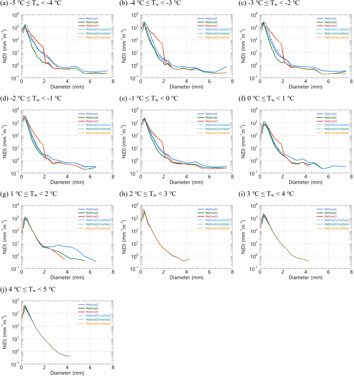 At temperatures ranging from 1 to 2 °C, the distribution of particles exceeding 2 mm in size was distinctly differentiated according to the QC method employed. This finding suggests that the fall velocity of particles larger than 2 mm exhibits considerable variation within this temperature interval (Fig. 10). Conversely, at temperatures below 1 °C, the distribution obtained through Method 3 displayed an anomalous pattern. This irregularity can be attributed to the failure of Method 3 to exclude snow particles smaller than 2 mm, leading to a higher concentration than that of the other QC methods. When considering the scenario in which particles are assumed to have melted, an increase in the concentration of water was observed for particles with a diameter of 1 mm or less when the Tw was between 0 and 1 °C, while the concentration of particles larger than 2 mm remained relatively unchanged.