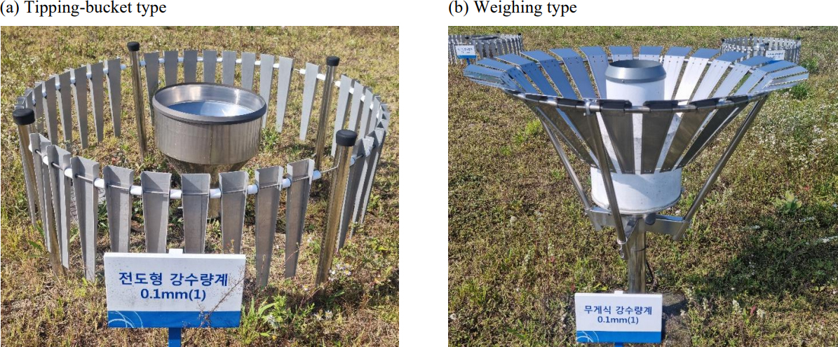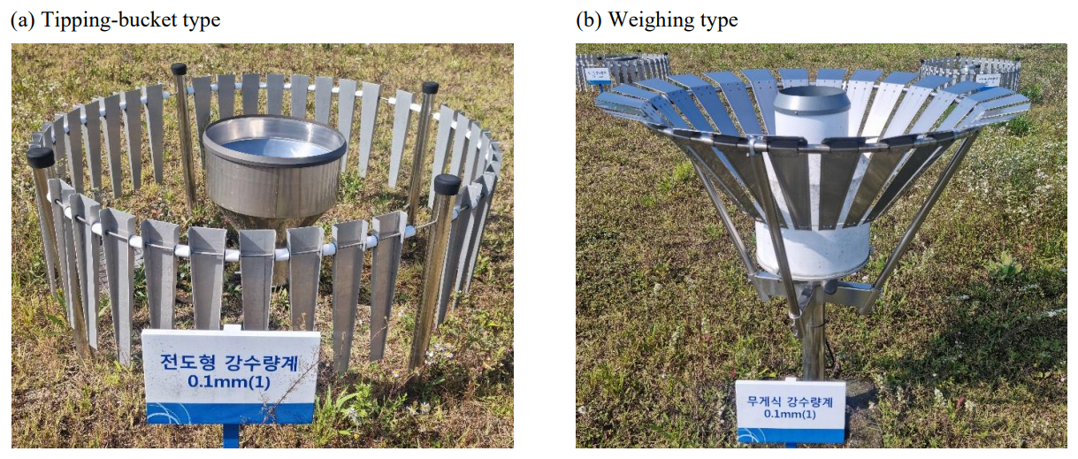 The utilization of long-term observational data considerably reduces errors, mainly by rectifying inaccuracies in the observational data and eliminating outliers. Even among instruments that measure the same meteorological parameters, the threshold values for outlier removal may vary based on the installation conditions and surrounding environment. Additionally, biases in the observed values can arise owing to variations in the observation area and resolution, which are contingent on the type of instrument employed (Sypka, 2019; Segovia-Cardozo et al., 2021). Ground-based rain gauges can be categorized into two types based on their measurement method: tipping-buckets and weighing gauges. Although the tipping-bucket type demonstrates high accuracy in measuring rainfall, its efficacy in measuring snowfall during winter may be inferior to that of the weighing type because the observation value is recorded only when the precipitation in the bucket reaches a predetermined capacity (Savina et al., 2012; Kochendorfer et al., 2020). Comprehending the characteristics of observational instruments and the data they produce is imperative to ensure the reliability of the research findings derived from observational data.