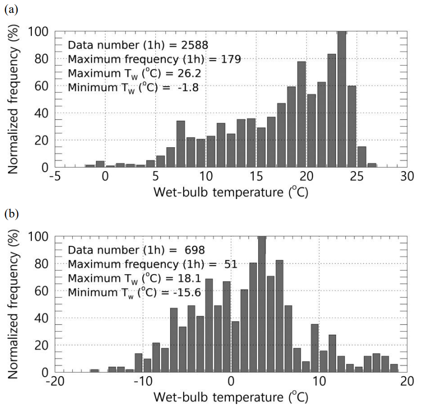 Figure 4Normalized frequency distribution of Tw during the analysis period (when the average hourly Tw is (a) Tw≥5 °C, (b) Tw<5 °C).