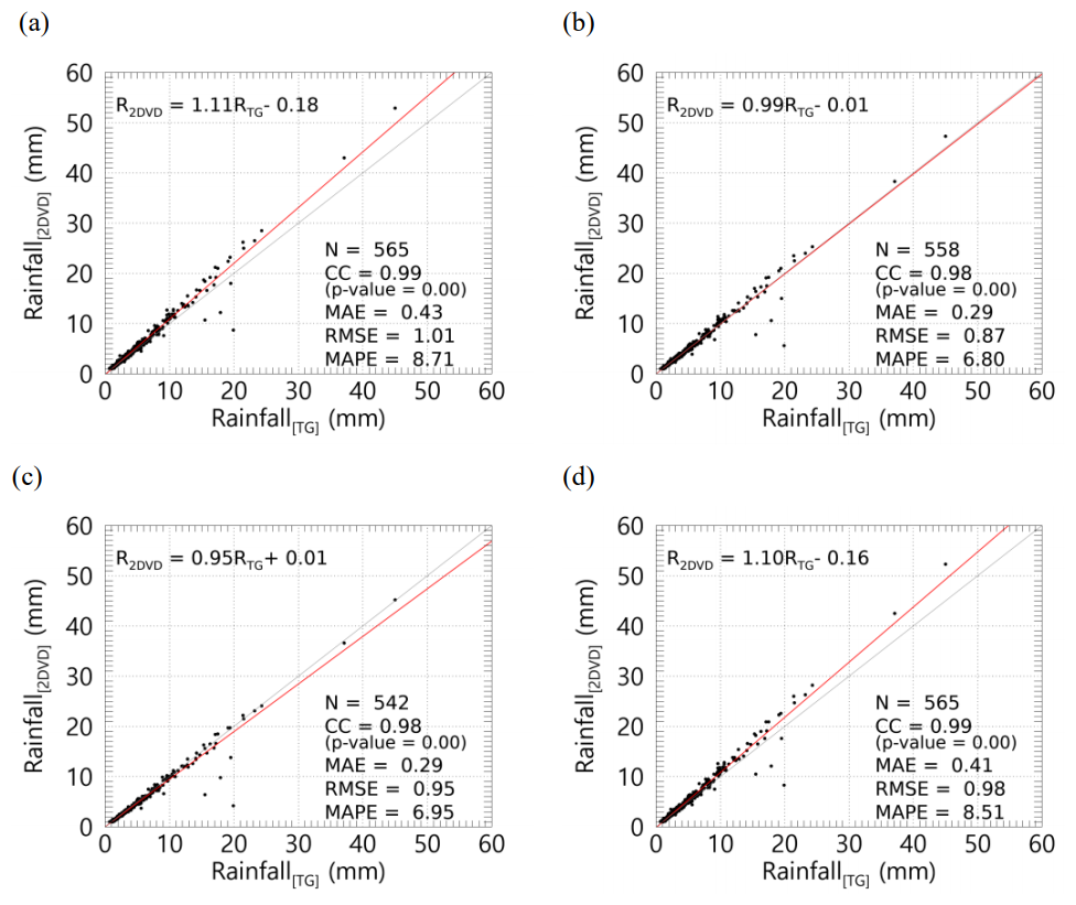Figures 5 and 6 presents a comparative analysis of hourly rainfall measurements obtained from the tipping-bucket and weighing rain gauge, specifically under conditions where the temperature (Tw) equals or exceeds 5 °C, alongside data from the 2DVD observations. The results derived from the unprocessed raw data were analyzed to evaluate the impact of the QC procedures. The findings indicated a strong correlation, exceeding 0.98, between the 2DVD and rain gauge measurements, with a regression line slope of approximately unity. However, the raw data tended to overestimate the 2DVD-derived rainfall estimates compared to the QC-processed results. This discrepancy in the overestimation of the 2DVD data can be attributed to variations in the conditions under which particles are eliminated, which is contingent on the specific QC method employed. Following the application of the QC methods, the mean absolute percentage error (MAPE) demonstrated an overall reduction compared with the raw data, suggesting that all QC methods possess quantitative reliability for rainfall data, with a maximum reduction of approximately 2.1 %.