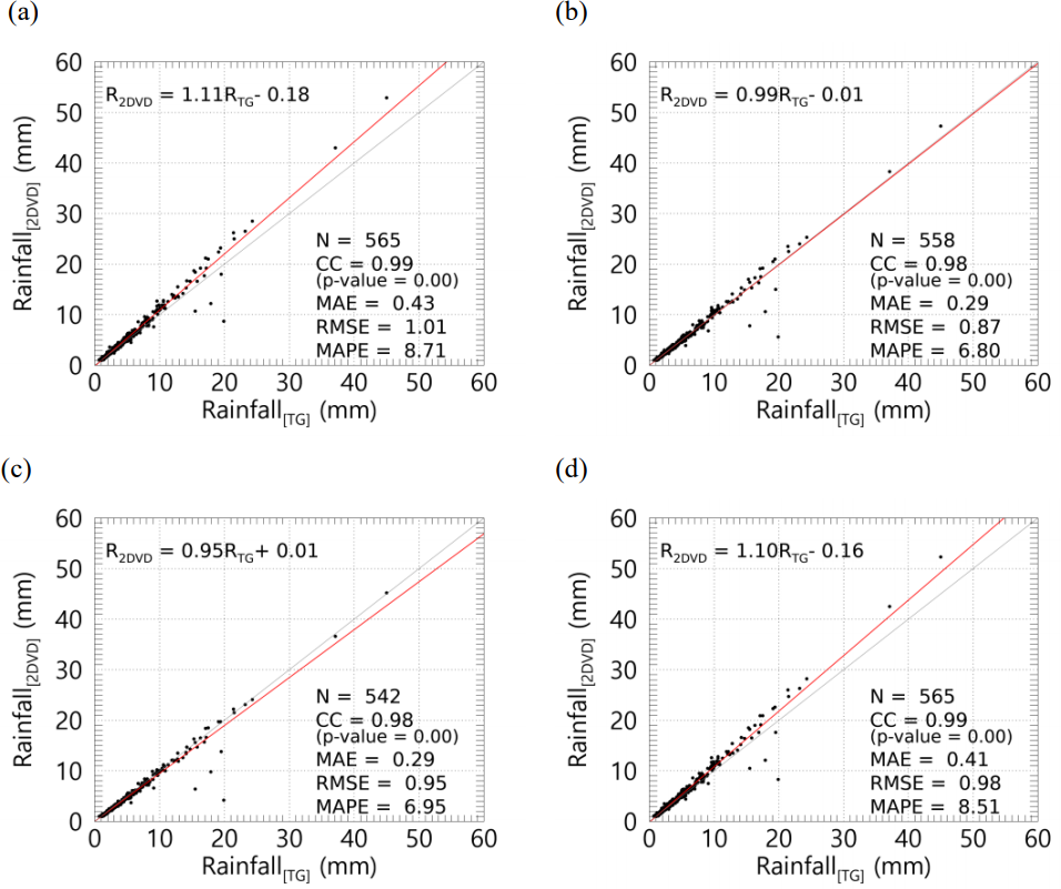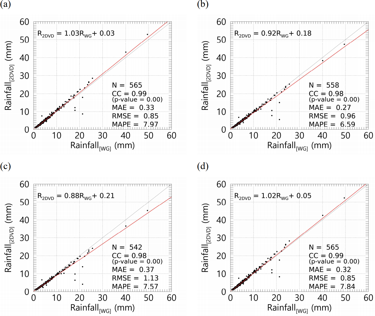 Figures 11 and 12 show the outcomes of the comparative analysis and validation of rainfall measurements derived from the QC method applied to each Tw range, juxtaposed with the rainfall values obtained from a rain gauge. Figure 11 shows the results of applying the QC method, which effectively filtered out all particles except for raindrops. In contrast, Fig. 12 depicts the assumption that the particles exhibiting low fall velocities are snow that melts and transforms into raindrops. The verification metrics employed in this analysis included the Root Mean Square Error (RMSE), Mean Absolute Error (MAE), MAPE, Correlation Coefficient (CC), slope (a1), and intercept (a0) derived from Eq. (16), which is the first-order regression equation correlating rainfall measurements from the rain gauge and 2DVD.