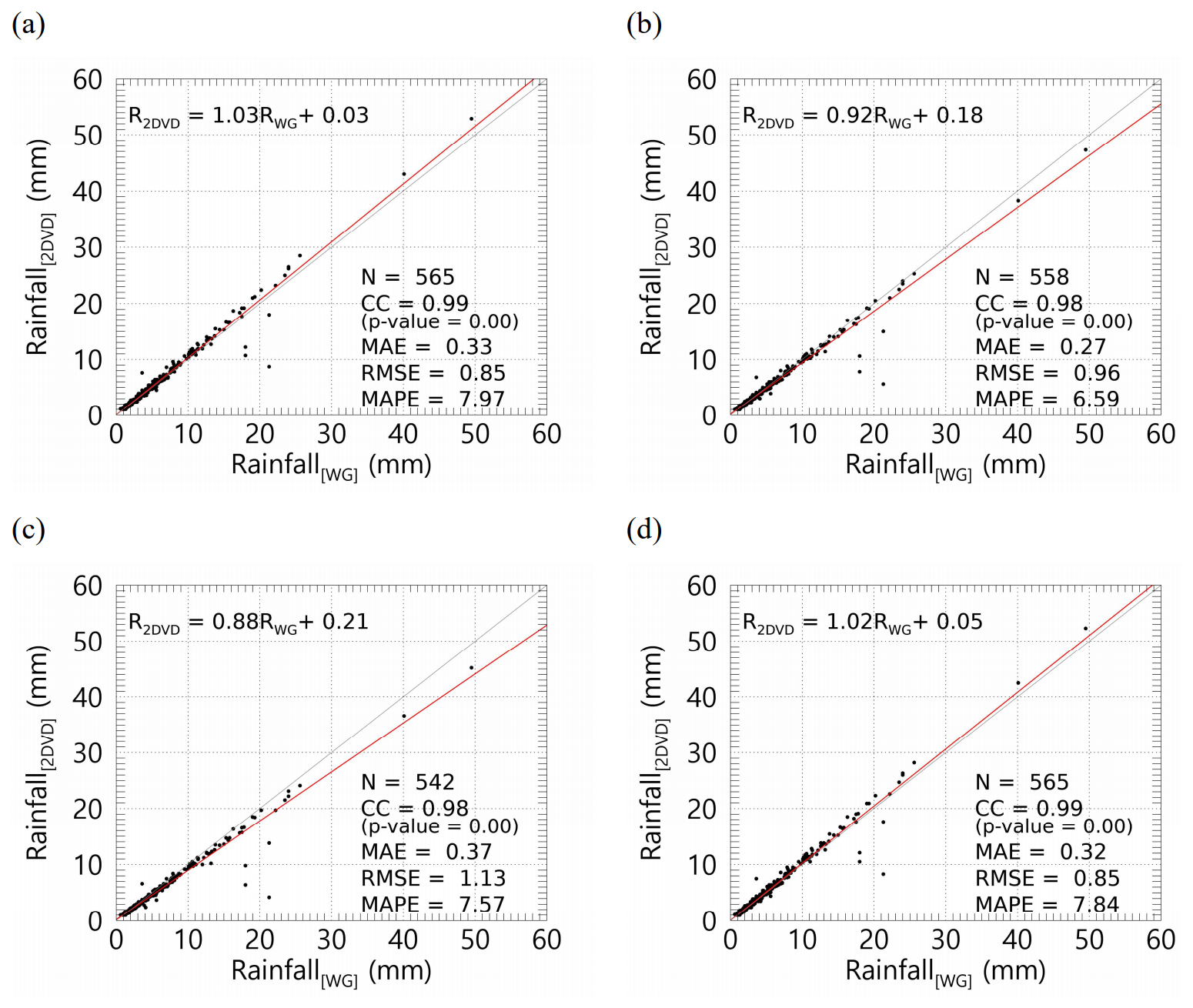 Figure 6Comparison of rainfall observed using the weighing rain gauge and 2DVD when Tw≥5 °C (a Unfiltered, b Method 1, c Method 2, d Method 3). RWG denotes the rainfall obtained from a weighing rain gauge.