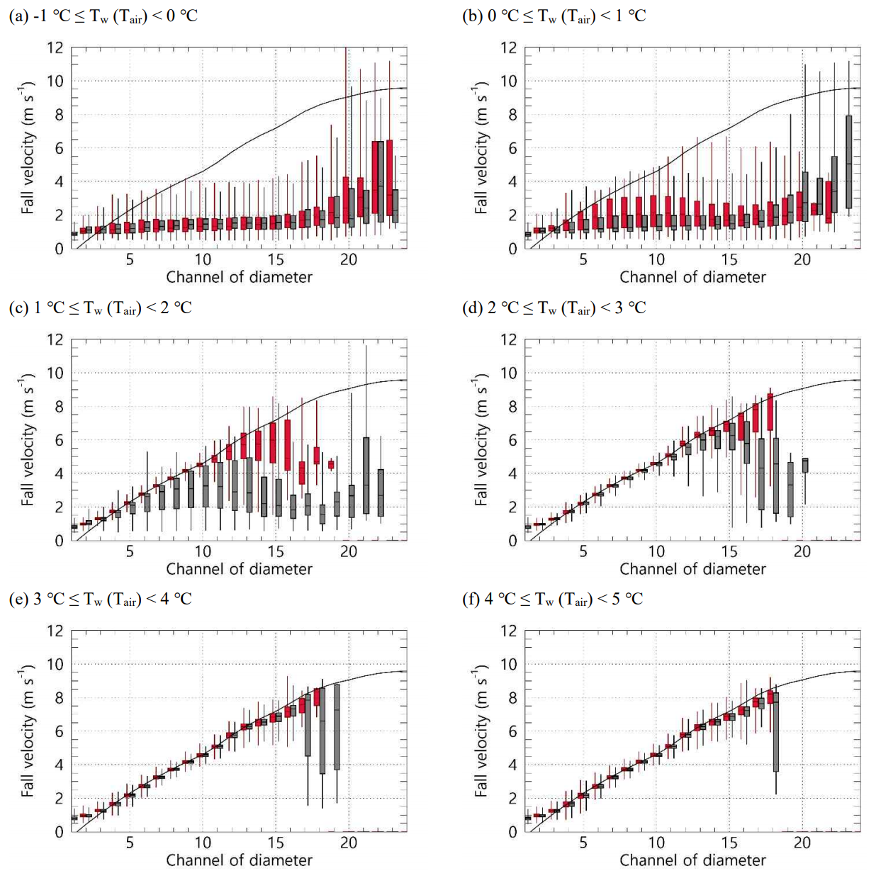 An analysis of the fall velocity corresponding to temperature intervals (Tw) of 1 °C revealed that when Tw is at or above 2 °C, the fall velocities correspond with those typically observed for raindrops. Conversely, at Tw values between 1 and 2 °C, particles with diameters of 2 mm or less fall within the raindrop velocity range; however, as the diameter increases to 2 mm or more, the fall velocity diminishes, stabilizing at approximately 5 m s−1. Temperature conditions (Tw) may indicate a mixture of raindrops and snow particles. At temperatures below 1 °C, the fall velocity of droplets with diameters of 4 mm or less decrease to approximately 3 m s−1, exhibiting a low-velocity distribution of 5 m s−1 or less across all diameter ranges. This distribution suggests a higher proportion of solid (snow) particles when Tw is less than 1 °C.