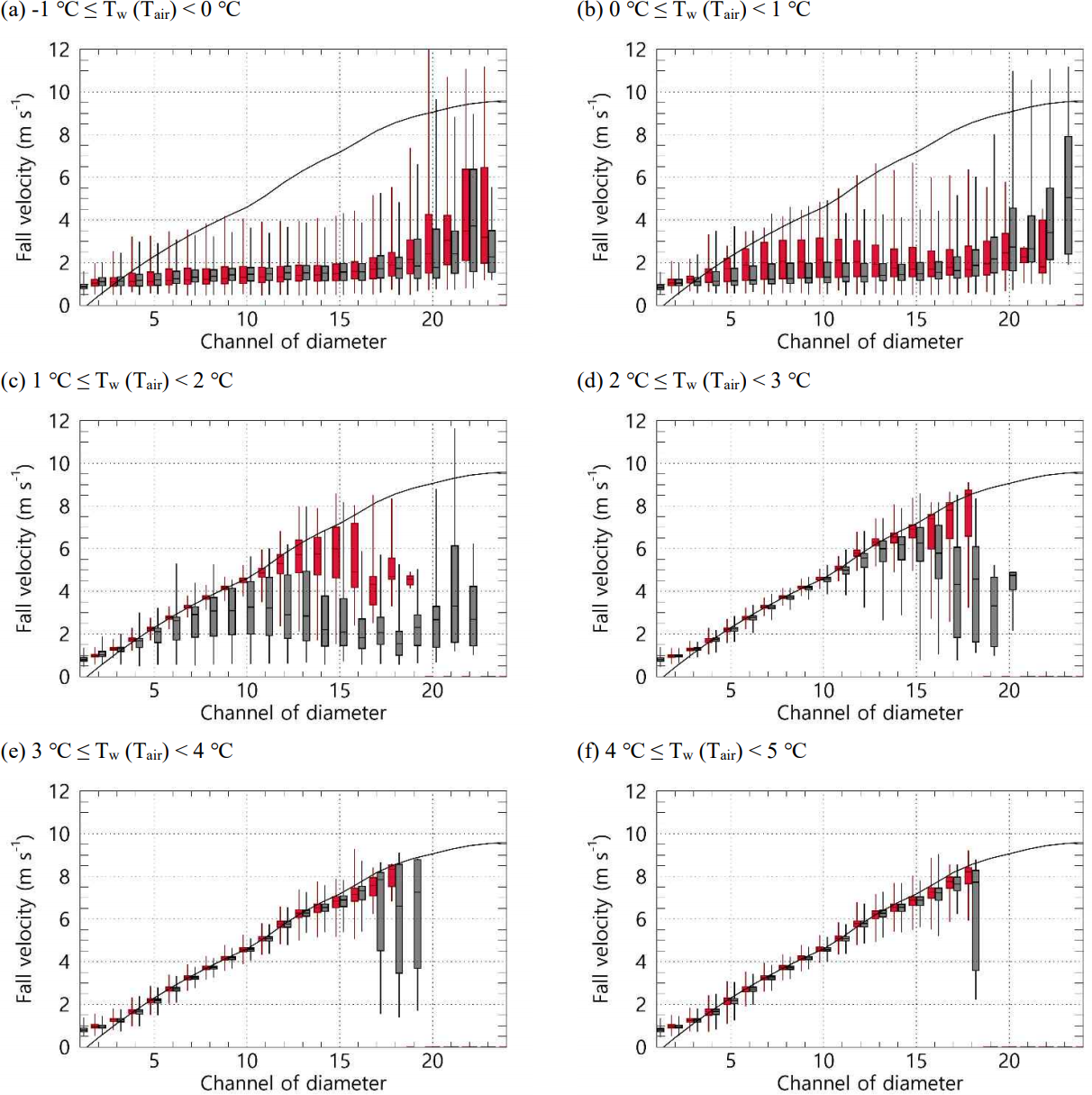 Figure 7 shows the distribution of the fall velocity with the diameter of precipitation particles (raindrops) under varying conditions of Tw and Tair. When the Tw and Tair ranged from −1 to 0 °C, the fall velocity distributions were relatively comparable. However, as the temperature exceeded 0 °C, the fall velocity for CH 4 to 18 increased under Tw conditions, while under the Tair condition, it exhibited values similar to those observed at temperatures below 0 °C (Fig. 7a and b). When Tw was below 0 °C, the upper 75 % value of fall velocity was less than 2 m s−1. However, as Tw increased above 0 °C, fall velocity increased to approximately 1 m s−1 or higher in the CH4–15 diameter range. Particularly in the CH8–11 range, the upper 75 % value exceeded 3 m s−1. Specifically, up to CH13, the fall velocity gradually increased with diameter, reaching large values exceeding 6 m s−1. Conversely, under Tair conditions, the upper 75 % fall velocity values for the CH1–15 range were 2 m s−1 or less in the 0–1 °C range. Under Tair conditions, the fall velocity increased when the temperature was above 1 °C. Notably, when the temperature rose above 1 °C, there was a notable increase in fall velocity; under Tw conditions, the distribution approached the terminal velocity of raindrops. Conversely, for diameters in the CH 12 or a higher range, the fall velocity remained at approximately 5.5 m s−1 despite increases in diameter. Under Tair conditions, the fall velocity increased when temperatures were above 1 °C. However, it remained lower than that observed under Tw conditions, with a broader distribution of fall velocities across the diameter channels (Fig. 7c). At 2 °C or higher temperatures, Tw and Tair conditions yielded fall velocity distributions that were close to the terminal velocity of raindrops, with an increasing trend in distribution as temperature increased (Fig. 7d–f). However, under Tair conditions, the fall velocity was notably low, remaining below 2 m s−1 for diameters of 3 mm (CH 17) or larger.