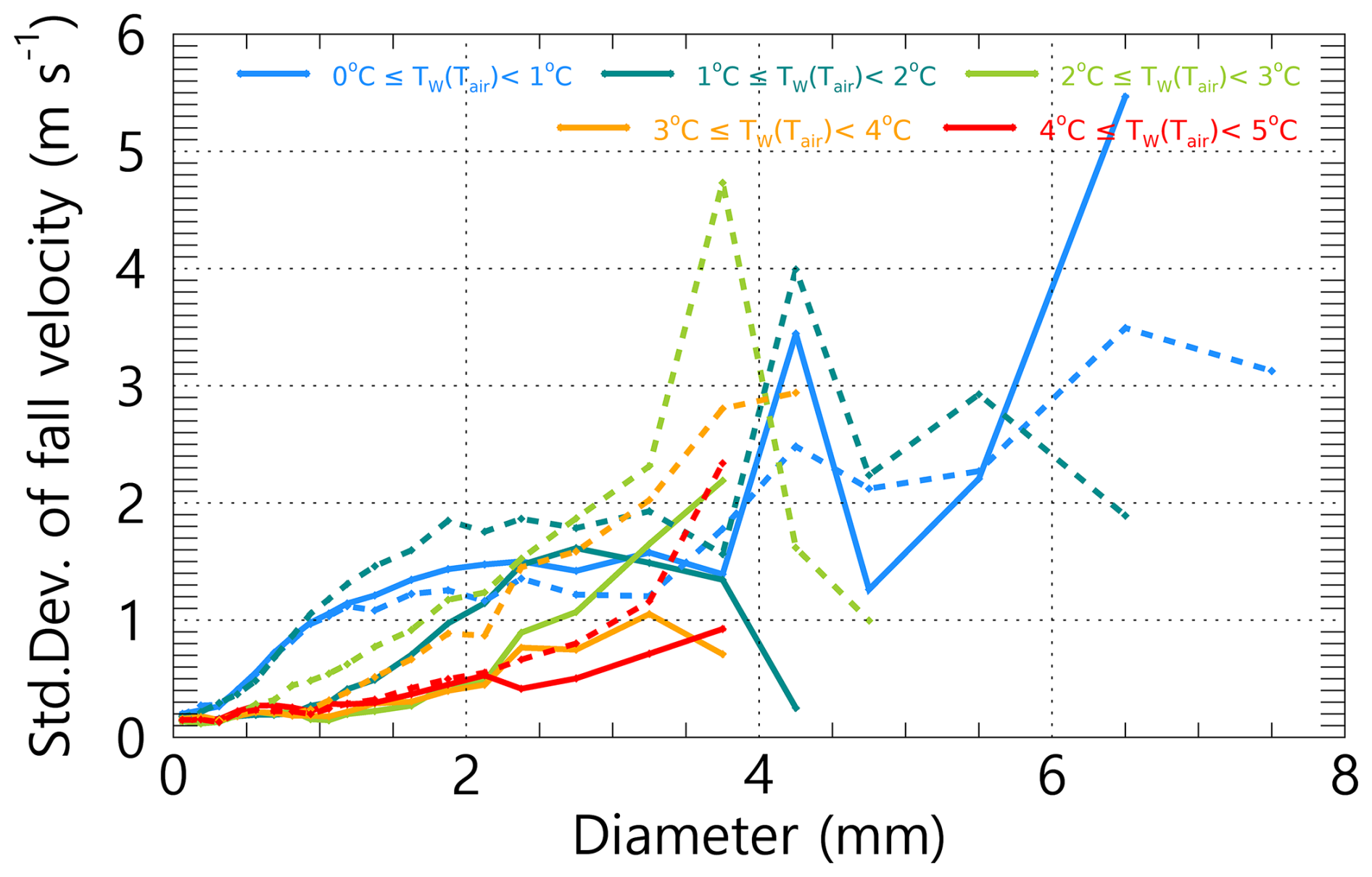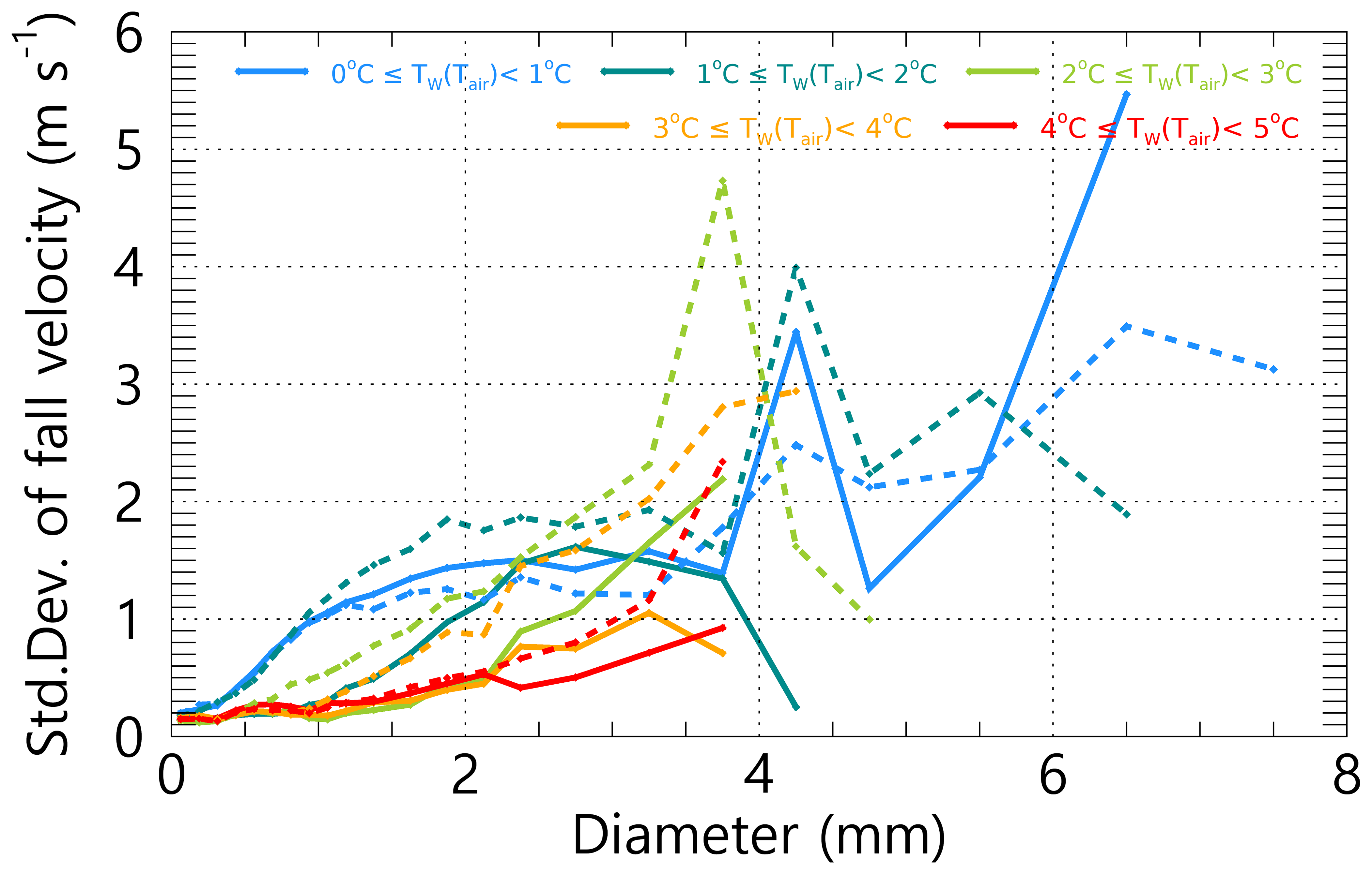 Figure 8 shows the variability in fall velocity with respect to the changes in temperature. Notably, despite Tw and Tair exhibiting similar numerical ranges, the distribution of fall velocity was considerably broader under Tair conditions. When Tw exceeds 3 °C, the standard deviation across all diameter intervals remains low, approximately 1 m s−1 or less. In instances where Tw ranges between 2 and 3 °C, an increase in distribution is observed for diameters of 2.5 mm or greater, while the standard deviation for diameters of 1 mm or more increases when Tw is between 1 and 2 °C. As temperature decreased, the range of diameters exhibiting increased fall velocity variability progressively expanded. According to the findings under Tair conditions, the standard deviation of fall velocity for diameters exceeding 1 mm begins to rise below 4 °C, with values surpassing 1 m s−1 for diameters greater than 2 mm. The observation that when Tair is between 2 and 3 °C, the standard deviation of fall velocity for diameters ranging from 3 to 4 mm is considerably increased, exceeding 2 m s−1 and reaching up to 4.5 m s−1 is noteworthy. This broad fall velocity distribution suggests a mixture of various hydrometeors, complicating the differentiation between rain and snow based solely on fall velocity. Consequently, subsequent analyses were conducted using Tw as the criterion for distinguishing between rain and snow.
