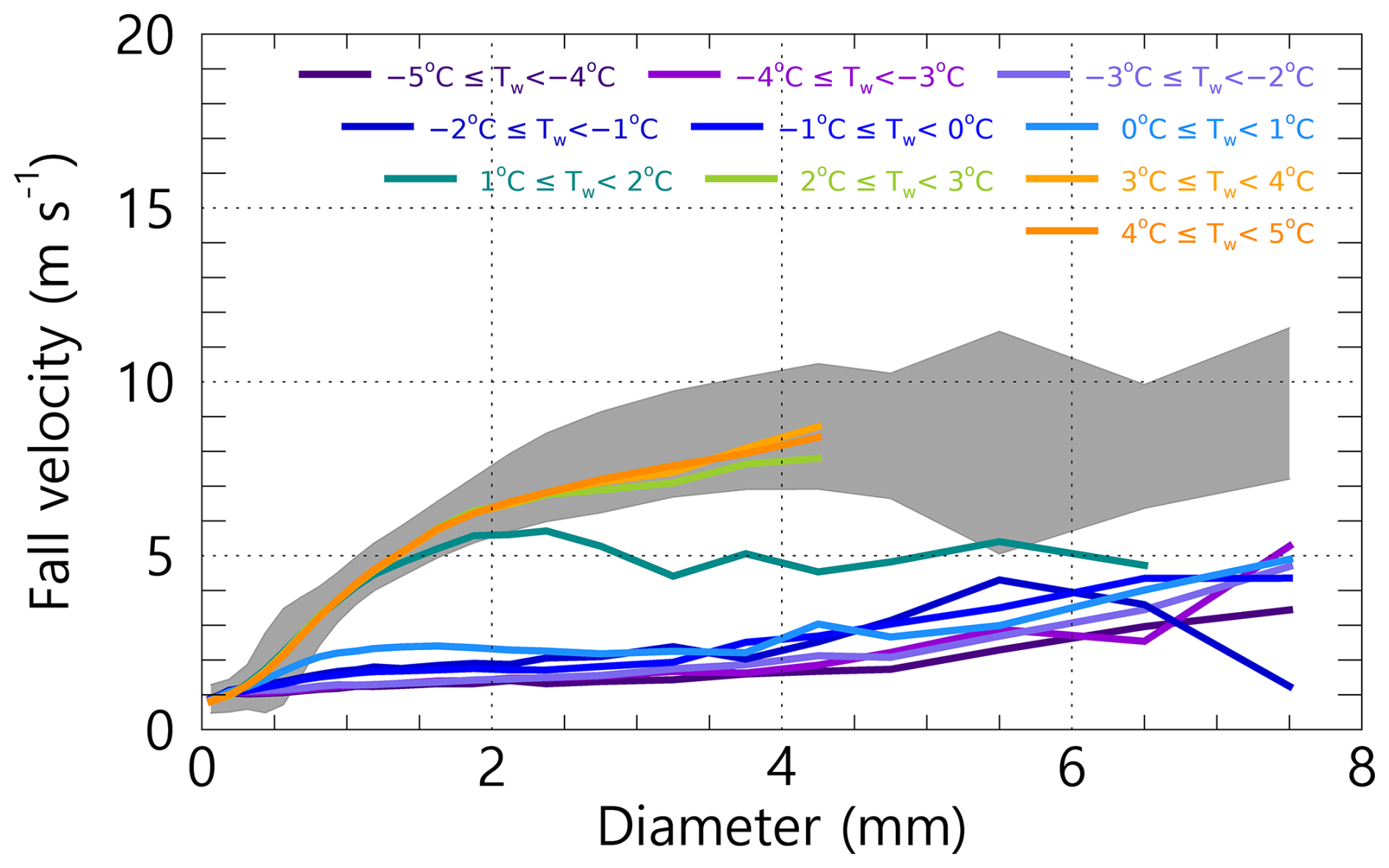 Figure 10Distribution of fall velocity by diameter in each Tw range. The grey area in the figure represents the Q1 (25 %) – Q3 (75 %) for the fall velocity by diameter when Tw≥5 °C.