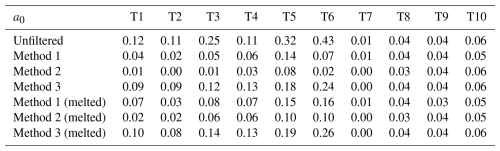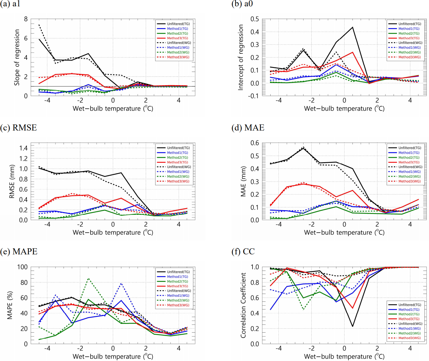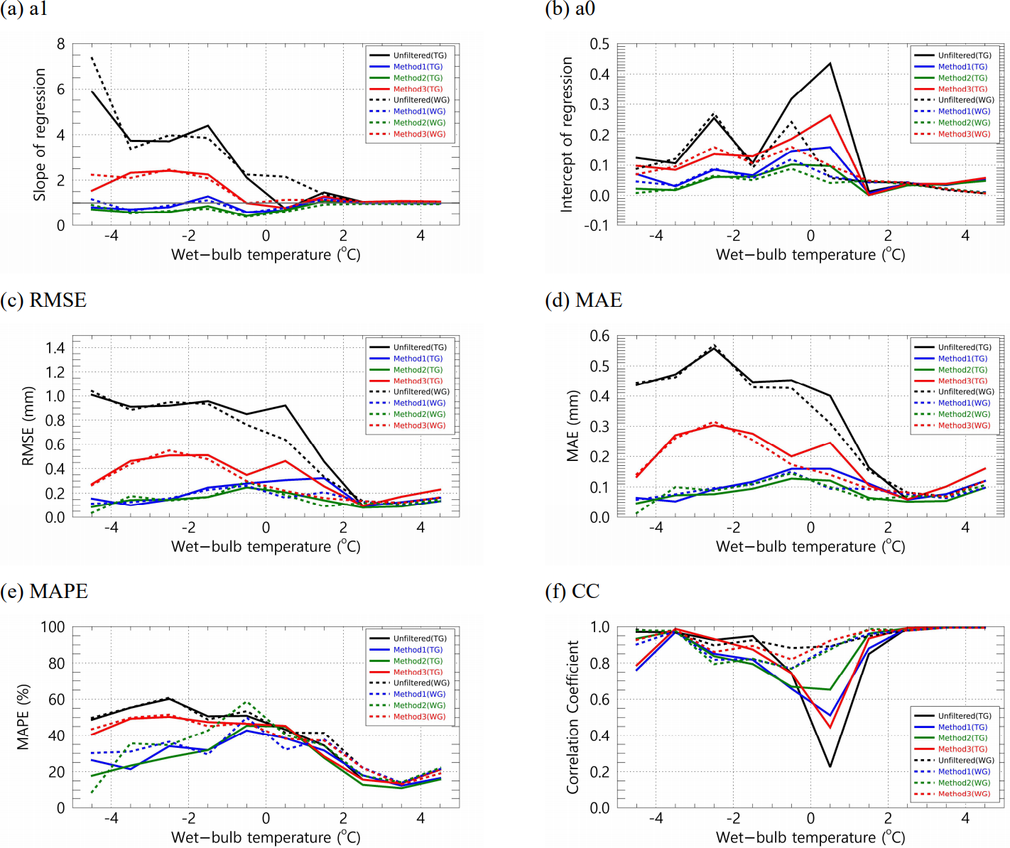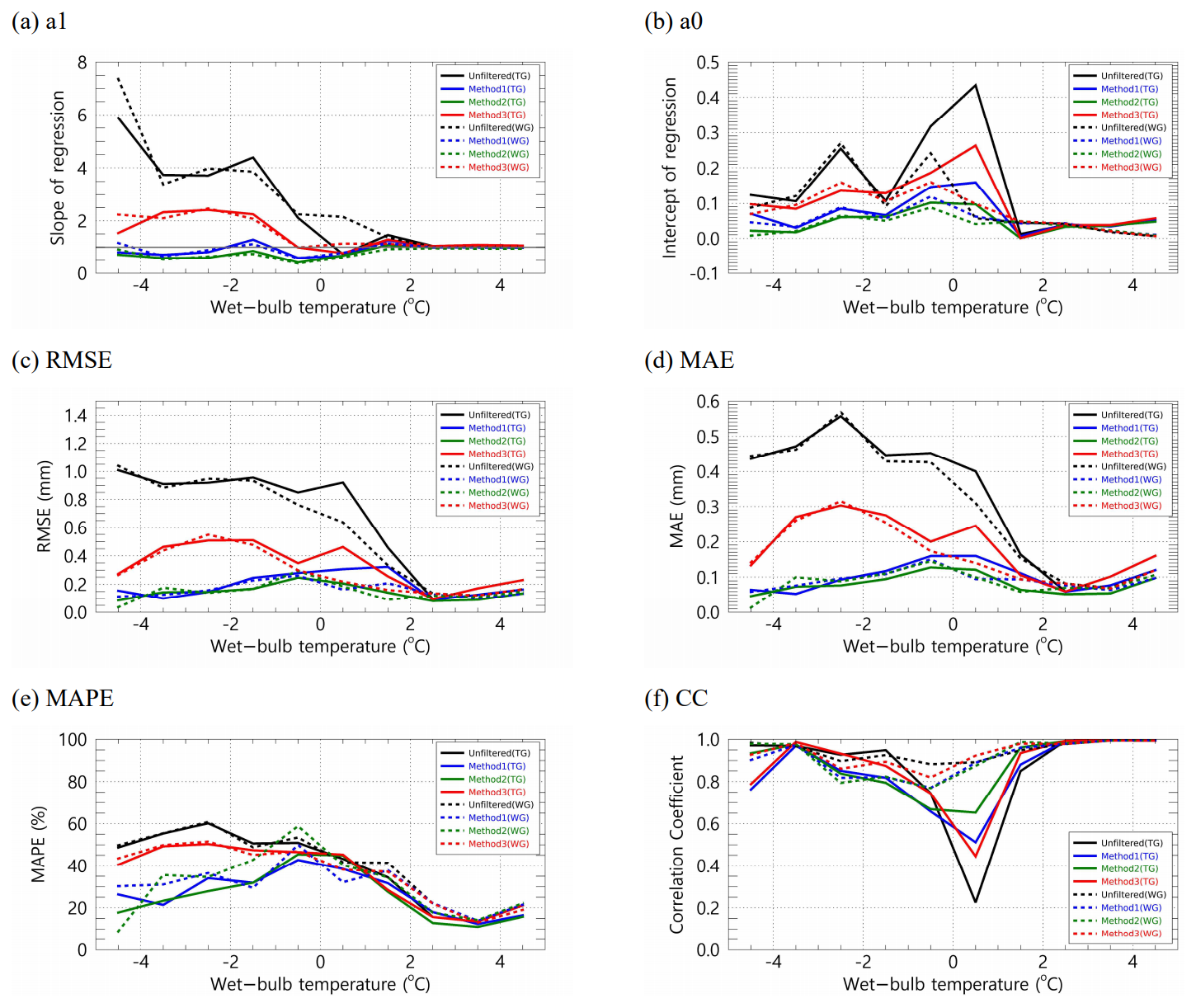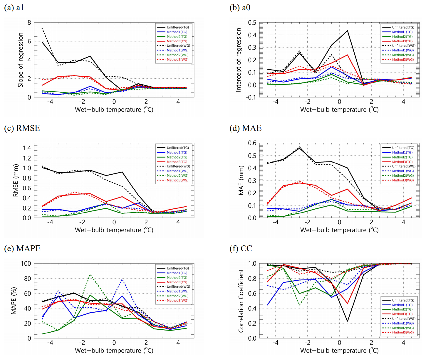 The a1 of the observed relationship indicates that when the Tw exceeds 2 °C, the value remains close to one before and following the application of QC. However, as Tw drops below 2 °C, the value of a1 either increases or decreases. A value of a1 greater than one suggests that the rainfall measurements derived from the 2DVD instrument tend to overestimate the corresponding values obtained from the rain gauge observations. In contrast, a value of less than one indicates an underestimation. Notably, in the absence of QC, a1 increases to two or more at temperatures below 0 °C, with the extent of overestimation intensifying as Tw decreases. This phenomenon is particularly evident when validated against a tipping-bucket rain gauge, where values of two or greater were recorded at temperatures ranging from 0 to 1 °C. This observation may be attributed to the different operational principles of the various rain gauge types within the specified Tw range (Fig. 11a). At Tw below 0 °C, the unfiltered data and Method 3 exhibit a0 values exceeding one, while Method 2 and Method 3 present a1 values below one. This discrepancy can be interpreted as a consequence of the varying quantities of preprocessed particles. For Tw values of 1 °C or higher, a0 is observed to range between 0 and 1; however, as Tw declines below 1 °C, a0 experiences a rapid increase. Method 3, which uses a smaller filter area for unfiltered particles and those with diameters of 2 mm or less, demonstrates a0 values of 0.2 or higher, exceeding those of Methods 1 and 2 (Fig. 11b).