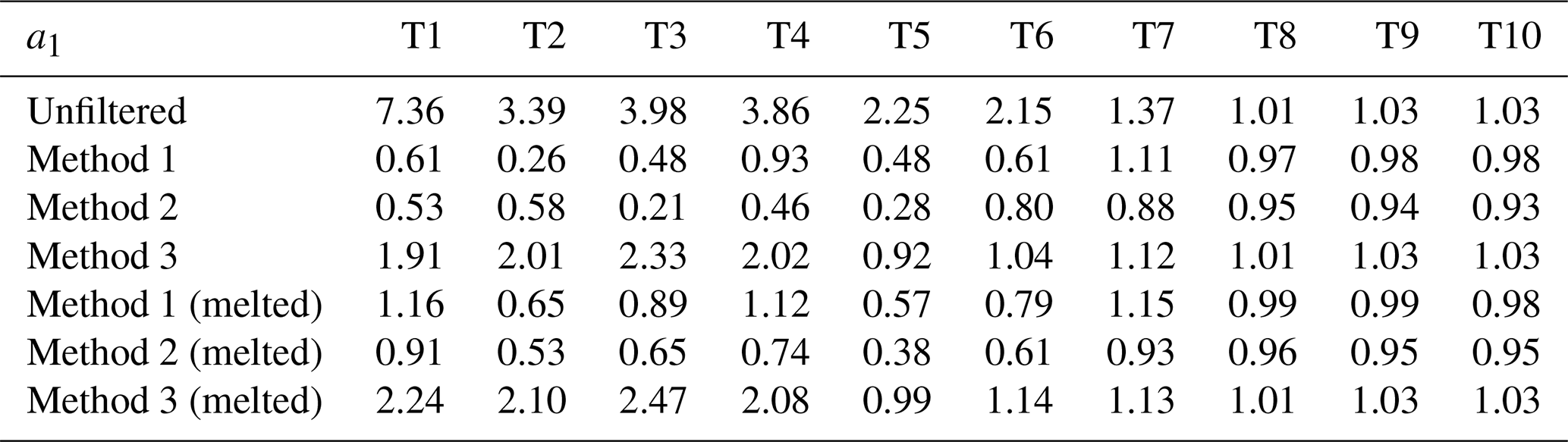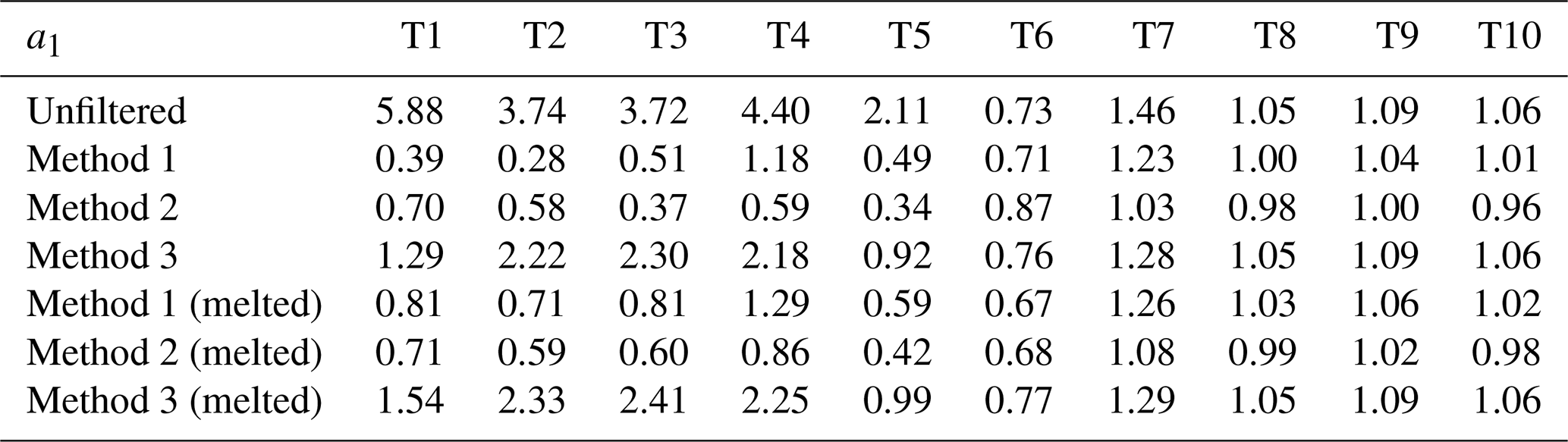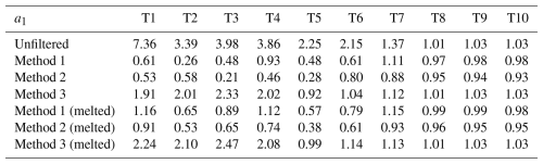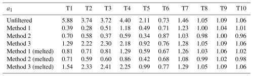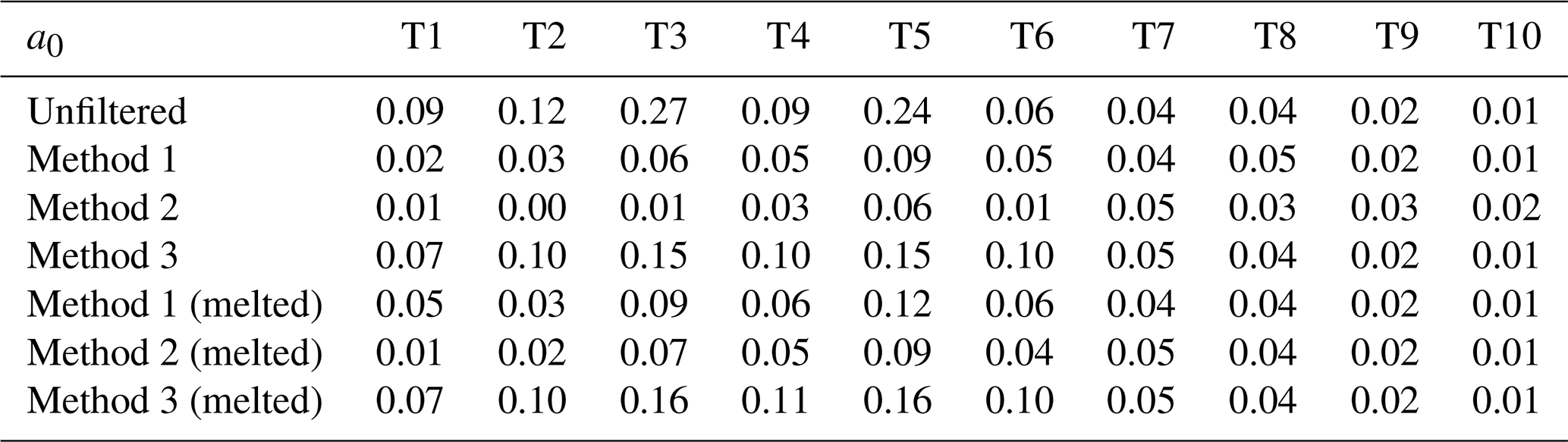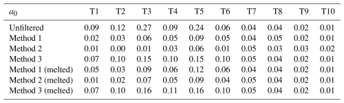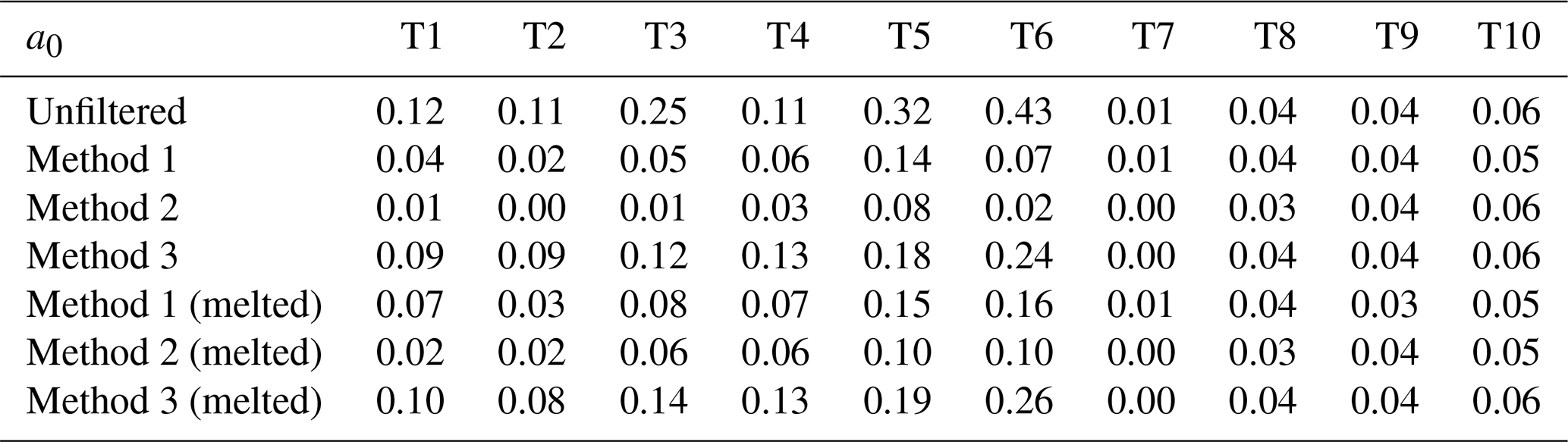 The a1 of the observed relationship indicates that when the Tw exceeds 2 °C, the value remains close to one before and following the application of QC. However, as Tw drops below 2 °C, the value of a1 either increases or decreases. A value of a1 greater than one suggests that the rainfall measurements derived from the 2DVD instrument tend to overestimate the corresponding values obtained from the rain gauge observations. In contrast, a value of less than one indicates an underestimation. Notably, in the absence of QC, a1 increases to two or more at temperatures below 0 °C, with the extent of overestimation intensifying as Tw decreases. This phenomenon is particularly evident when validated against a tipping-bucket rain gauge, where values of two or greater were recorded at temperatures ranging from 0 to 1 °C. This observation may be attributed to the different operational principles of the various rain gauge types within the specified Tw range (Fig. 11a). At Tw below 0 °C, the unfiltered data and Method 3 exhibit a0 values exceeding one, while Method 2 and Method 3 present a1 values below one. This discrepancy can be interpreted as a consequence of the varying quantities of preprocessed particles. For Tw values of 1 °C or higher, a0 is observed to range between 0 and 1; however, as Tw declines below 1 °C, a0 experiences a rapid increase. Method 3, which uses a smaller filter area for unfiltered particles and those with diameters of 2 mm or less, demonstrates a0 values of 0.2 or higher, exceeding those of Methods 1 and 2 (Fig. 11b).