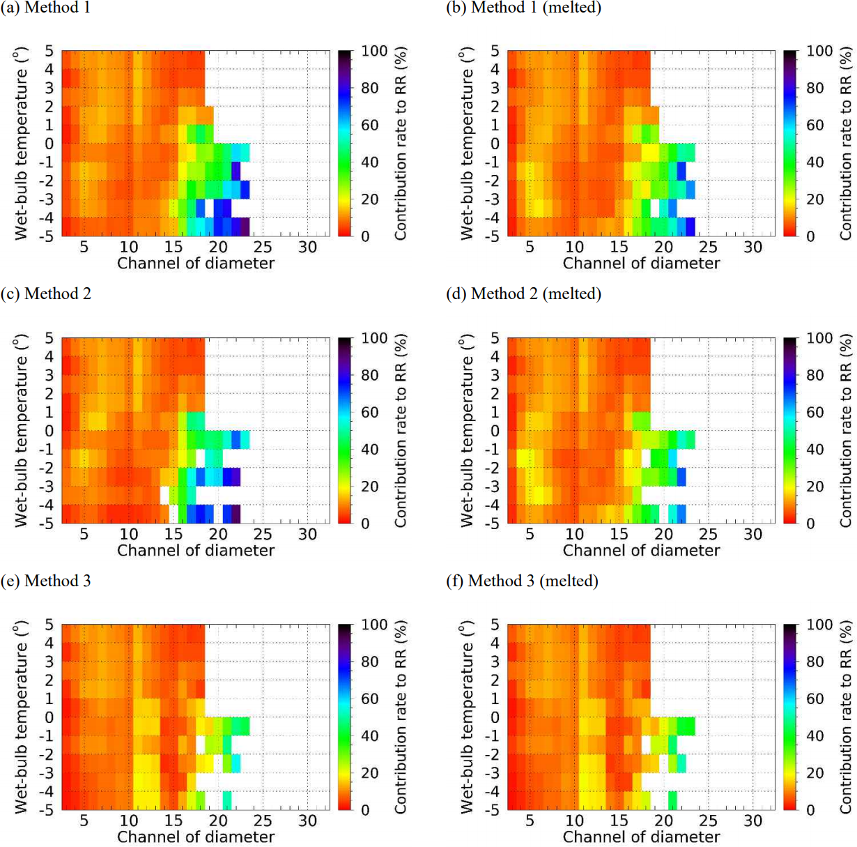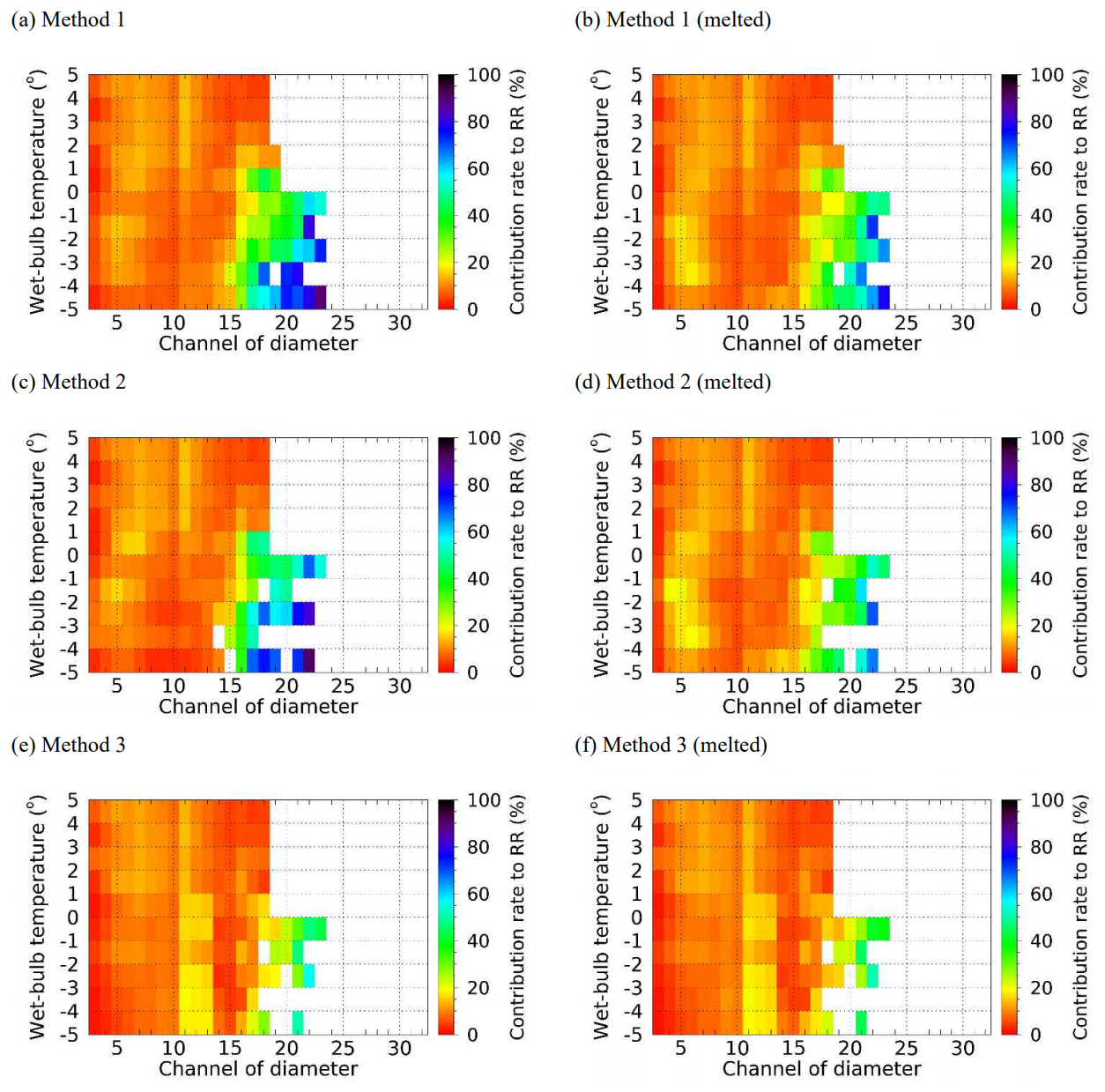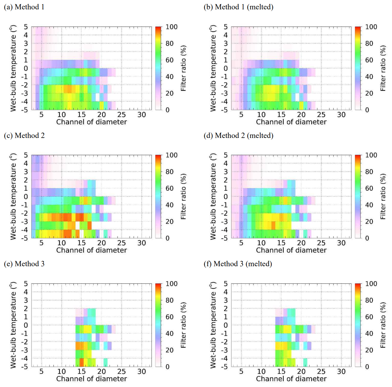 In scenarios where it is assumed that snow particles have melted, the diameter of these particles decreases, increasing the concentration of smaller particles. As a result, the contribution rate of diameter from approximately 0.5 to 1 mm (CH 5 to 10) increased. Notably, in Method 3, there was a minimal removal of particles smaller than 2 mm, which resulted in negligible differences between the scenarios that accounted for the melted state of snow particles and those that did not.