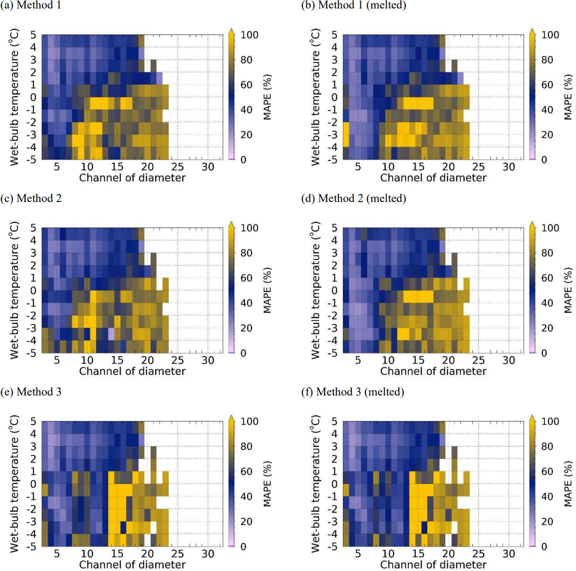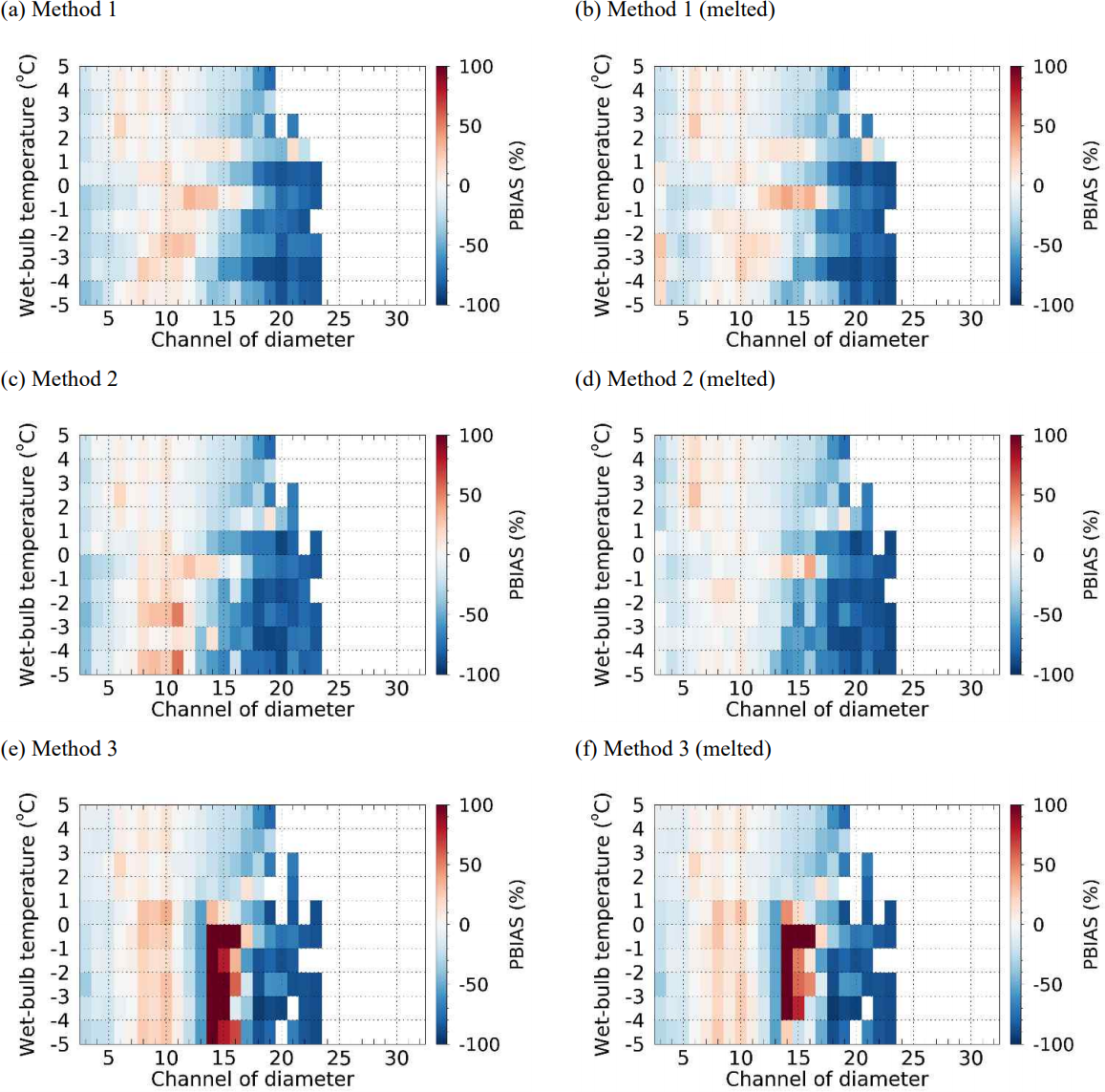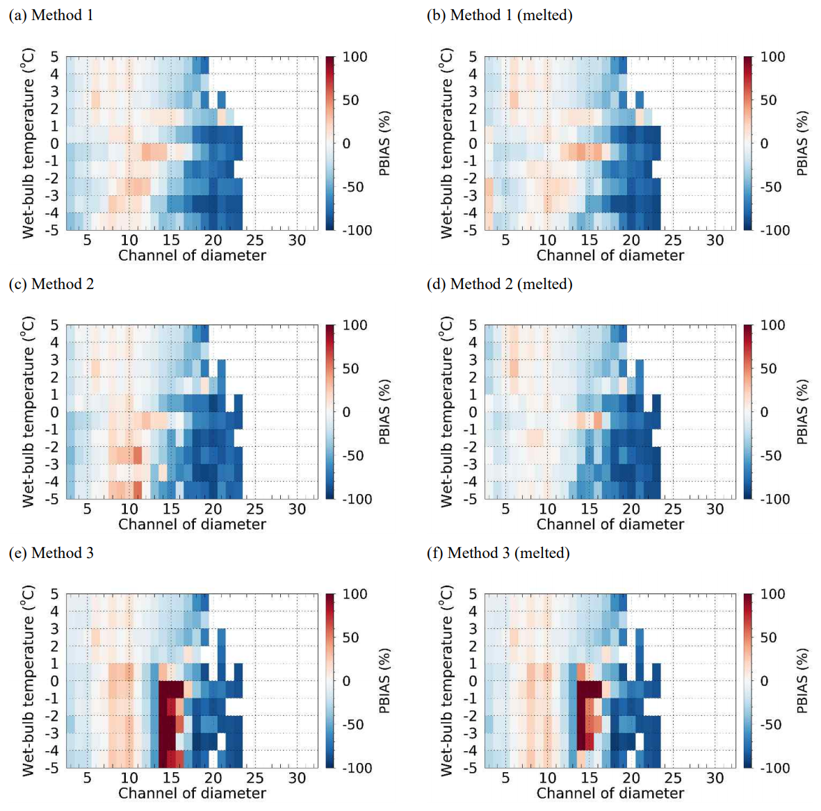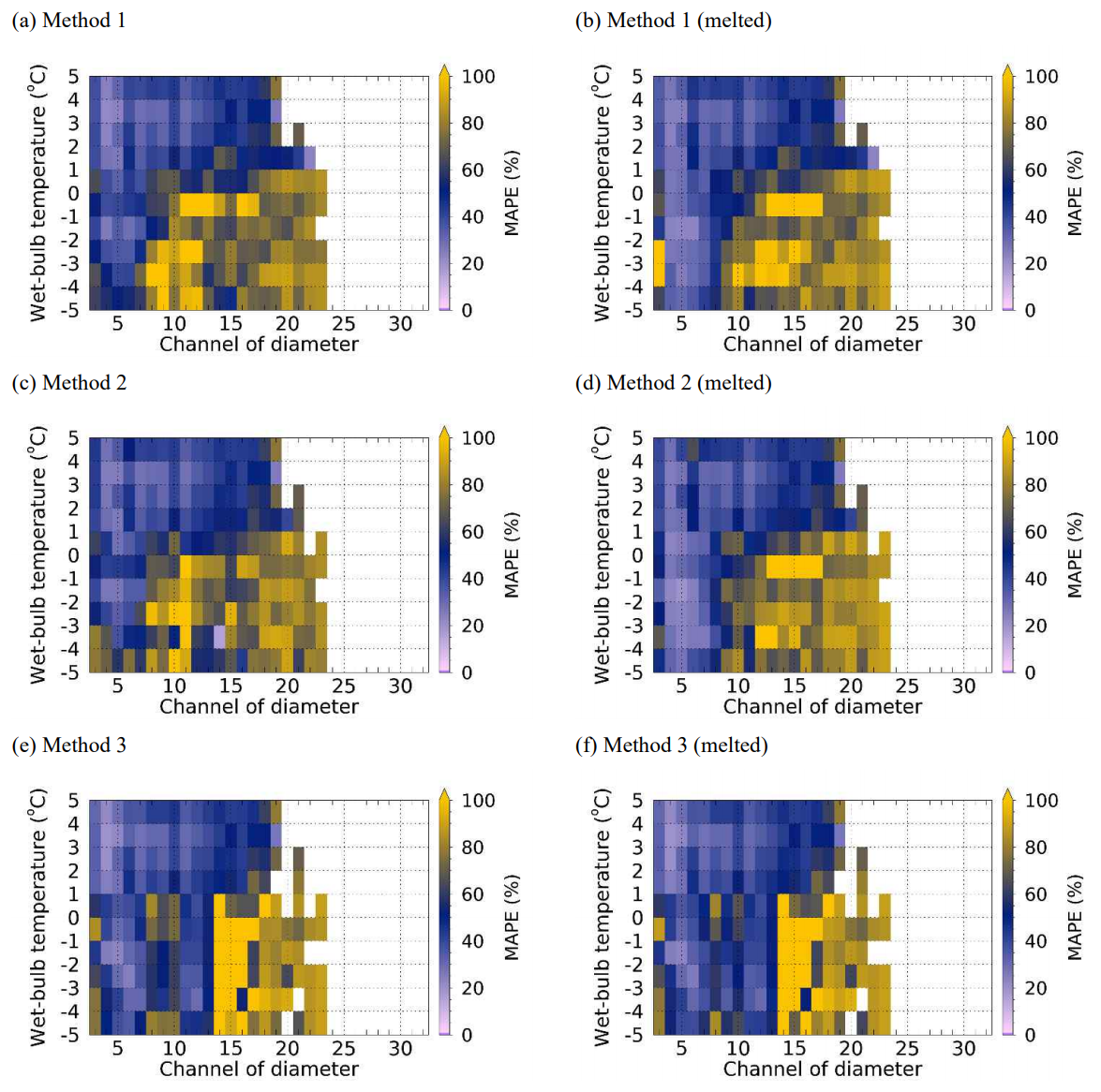 In scenarios where it is assumed that snow particles have melted, the diameter of these particles decreases, increasing the concentration of smaller particles. As a result, the contribution rate of diameter from approximately 0.5 to 1 mm (CH 5 to 10) increased. Notably, in Method 3, there was a minimal removal of particles smaller than 2 mm, which resulted in negligible differences between the scenarios that accounted for the melted state of snow particles and those that did not.