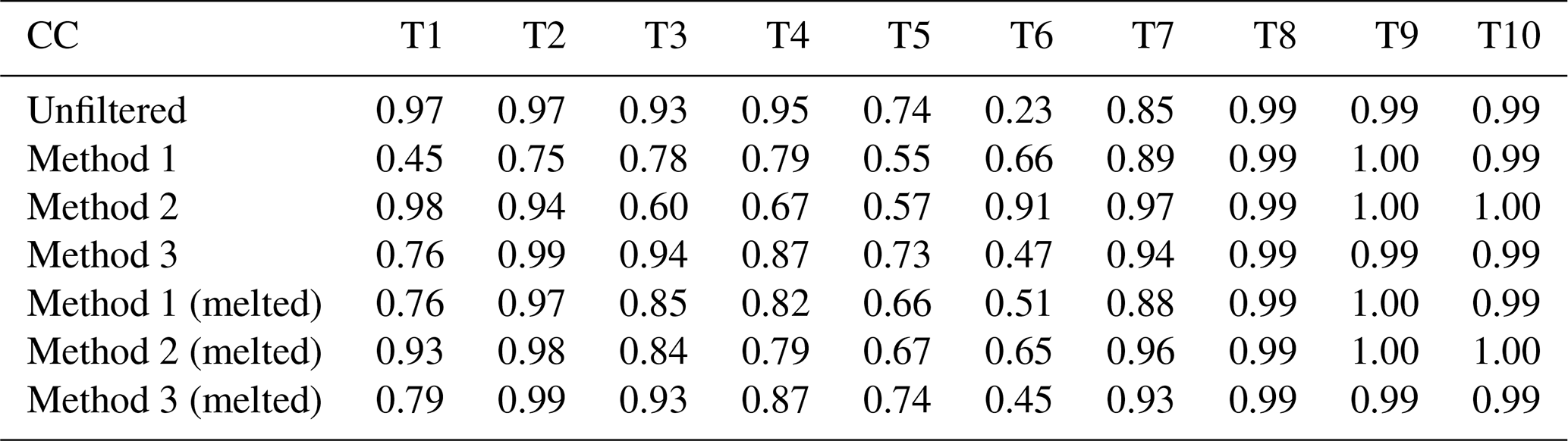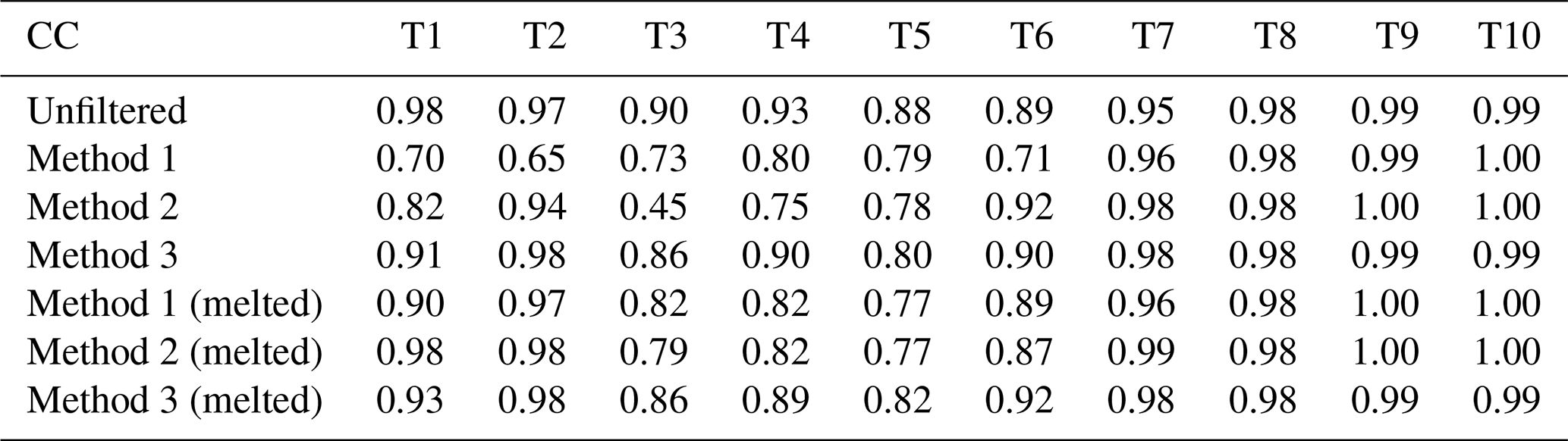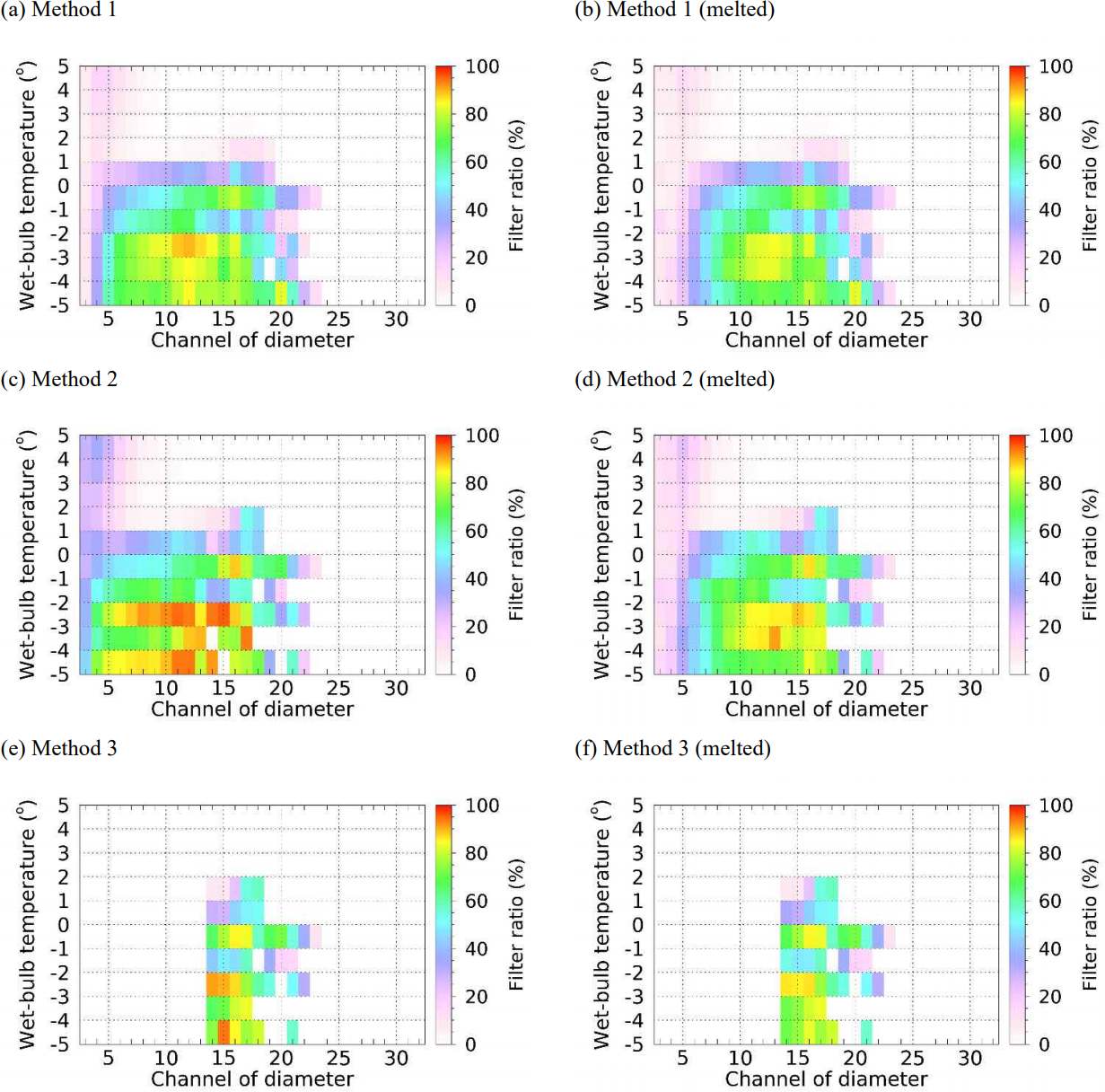 Precipitation measurements obtained from the disdrometer were derived from raindrop (or snow particle) accumulation. The quantitative errors associated with these precipitation measurements were assessed by comparing the filter rates of raindrops (or snow particles) using the QC method. Figure 13 shows the filter ratios corresponding to the Tw range and channel diameter. The two methods, Method 1 and Method 2, exhibit differences in the range of removal velocities based on particle diameter (see Fig. 9); specifically, Method 2 encompasses a broader spectrum of raindrop sizes compared to Method 1, leading to an increased filter rate when the Tw is below 0 °C. Notably, the filter rate for Method 2 surpasses that of Method 1 at temperatures lower than −2 °C. Conversely, Method 3 did not allow the removal of particles smaller than 2 mm (as indicated in CH 14), regardless of their low fall velocity, resulting in a consistent filter rate of 0 %, irrespective of variations in Tw. This suggests that the number of particles smaller than 2 mm may be greater in Methods 1 and 2. Furthermore, the filter rate was lower when snow particles were assumed to have melted than when they had not melted. Nonetheless, for particles with a diameter of 1 mm or less, the filter rate ranged from approximately 10 % to 30 % when Tw exceeded 1 °C, which appears to be attributable to the removal of particles exhibiting a fall velocity that exceeds the raindrops.