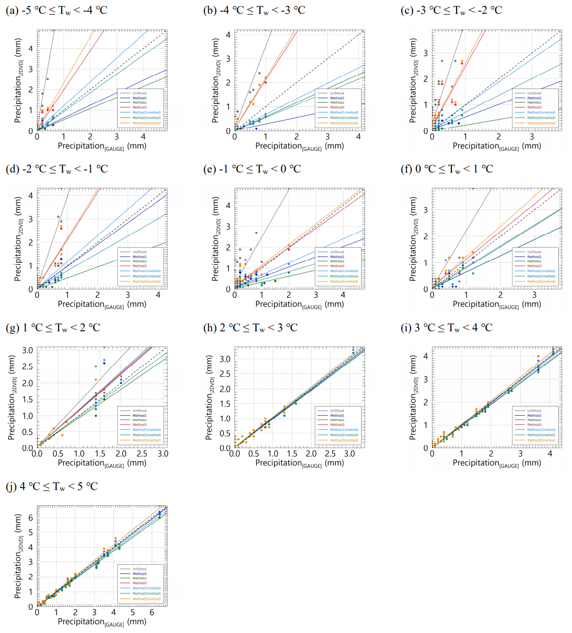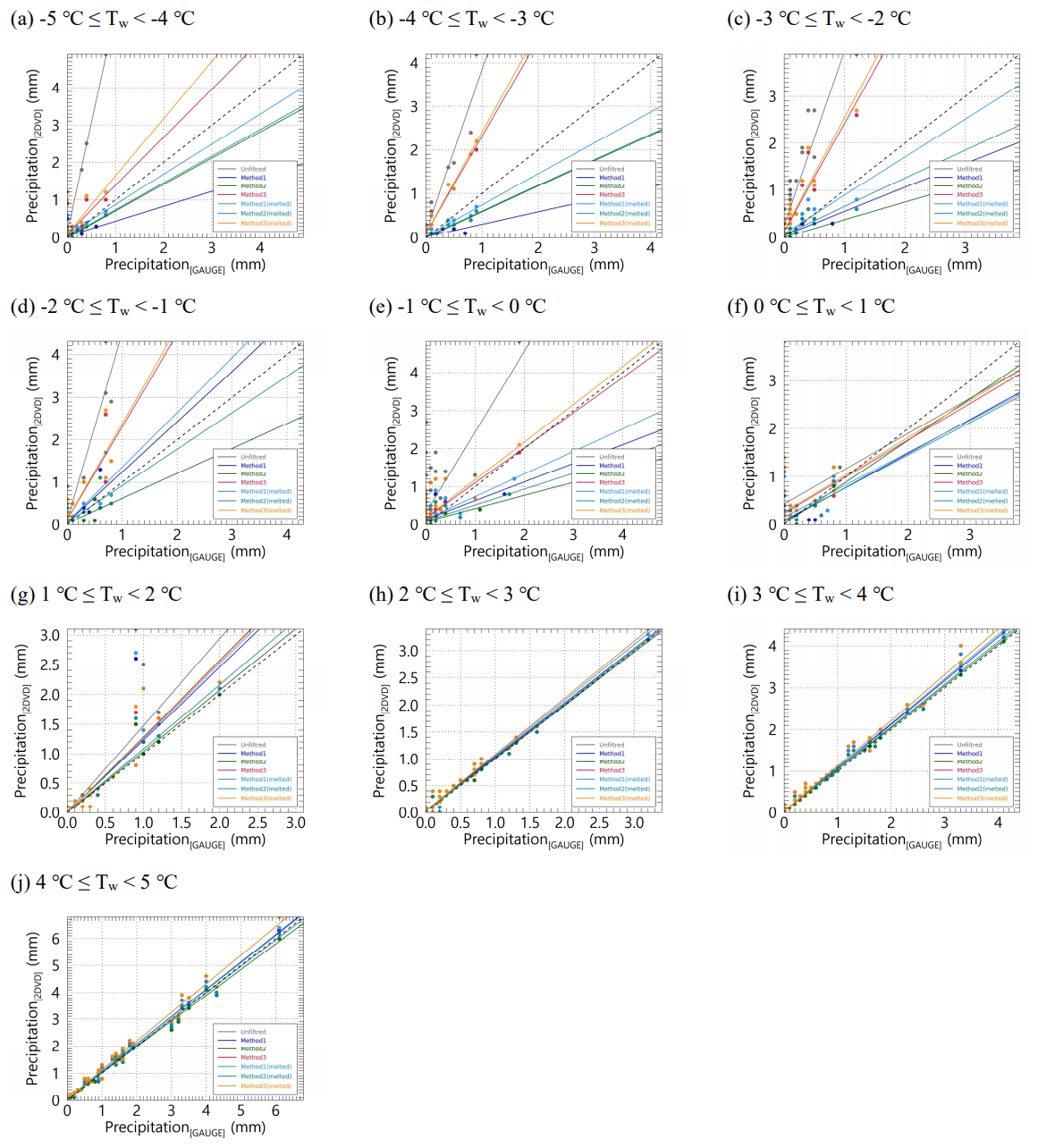 Figures A1 and A2 present the findings from a comparative analysis of hourly accumulated precipitation intensity, derived from observations using the 2DVD and two types of rain gauges (Tables A1–A6 represent the tipping-bucket type and Tables A7–A12 represents the weighing type) under the specified Tw interval conditions at 1 °C intervals. In each figure, the solid line denotes the regression line correlating the precipitation intensities derived by applying each quality control (QC) method. The constants and validation indices associated with the regression lines are listed in Tables A1–A12, respectively. Tables A13 and A14 provide details regarding the diameter and velocity channels used to calculate the number concentration based on 2DVD data. The channel information corresponded to the values employed in the PARSIVEL disdrometer data.