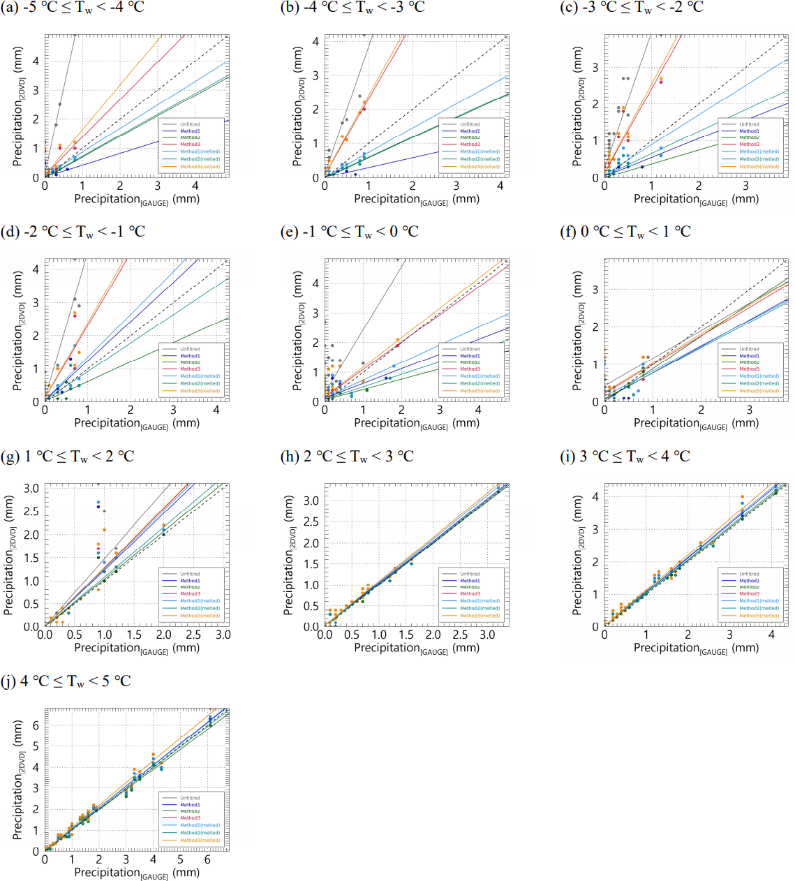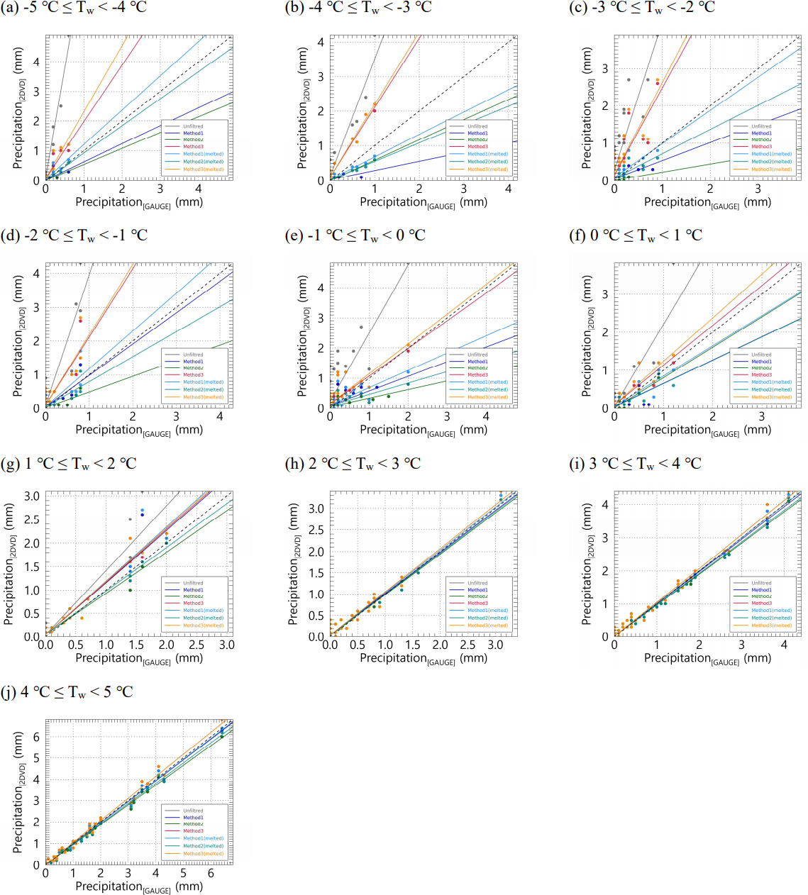 Furthermore, the low volatility and high correlation observed in the verification results using the weighing rain gauge within the Tw range can be explained by incorporating raindrops and snow particles in the 0–1 °C range. By assuming melting of snow particles, both forms of precipitation can be integrated into precipitation calculations. The weighing rain gauge recorded precipitation values that accounted for the cumulative weight of all the raindrops and snow particles (Fig. A2f in the Appendix).