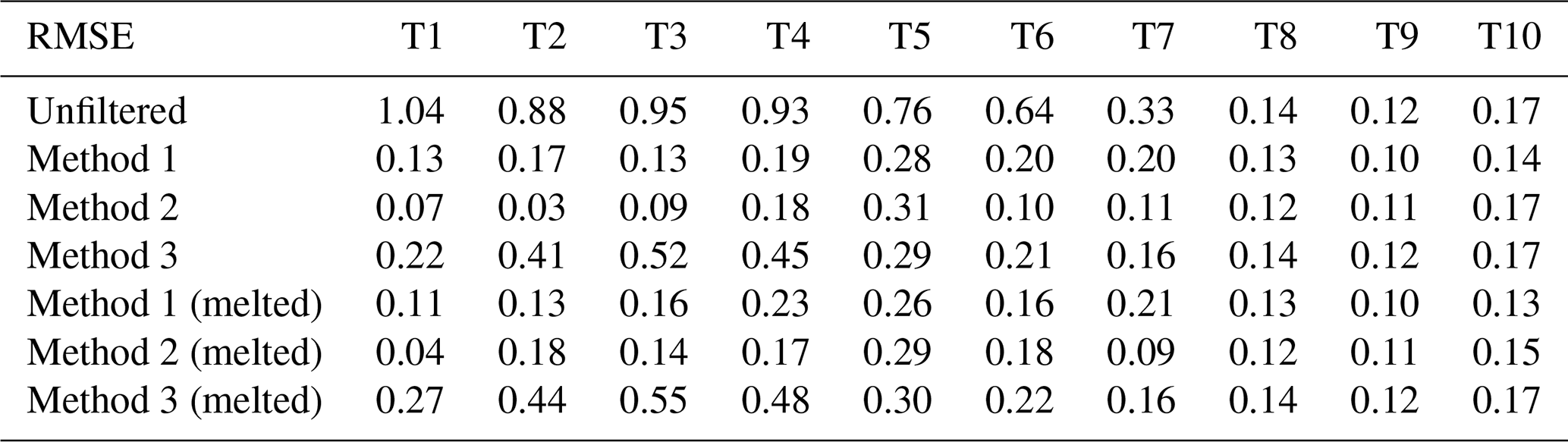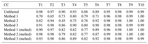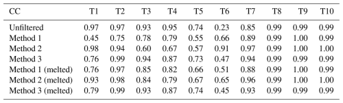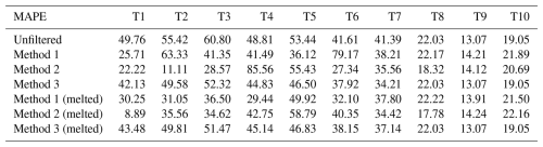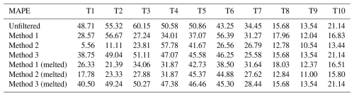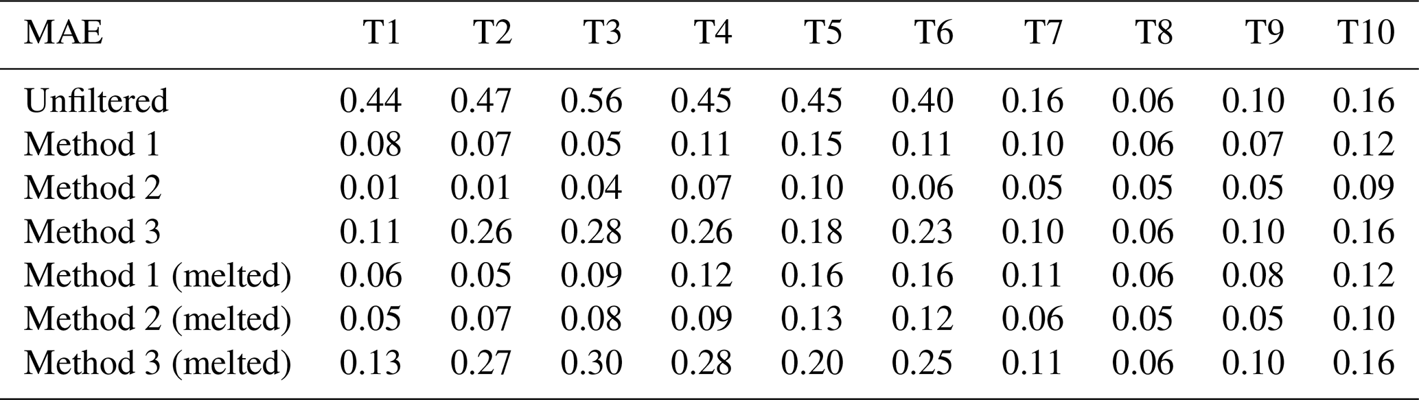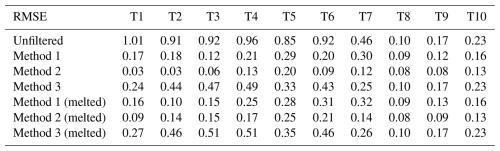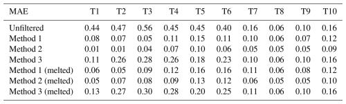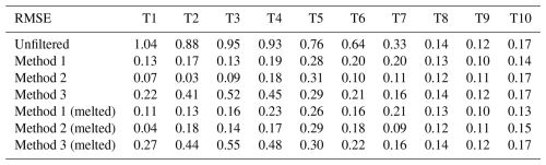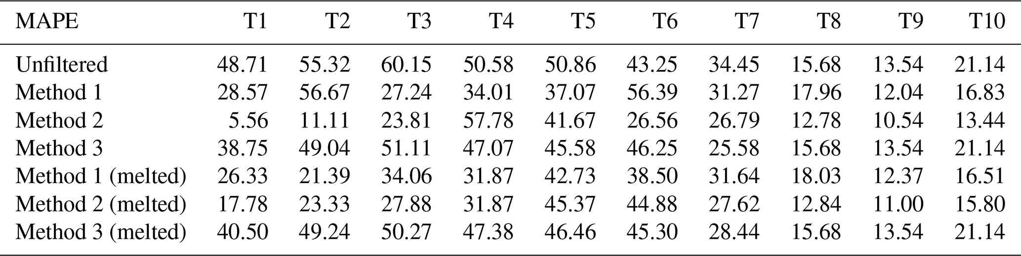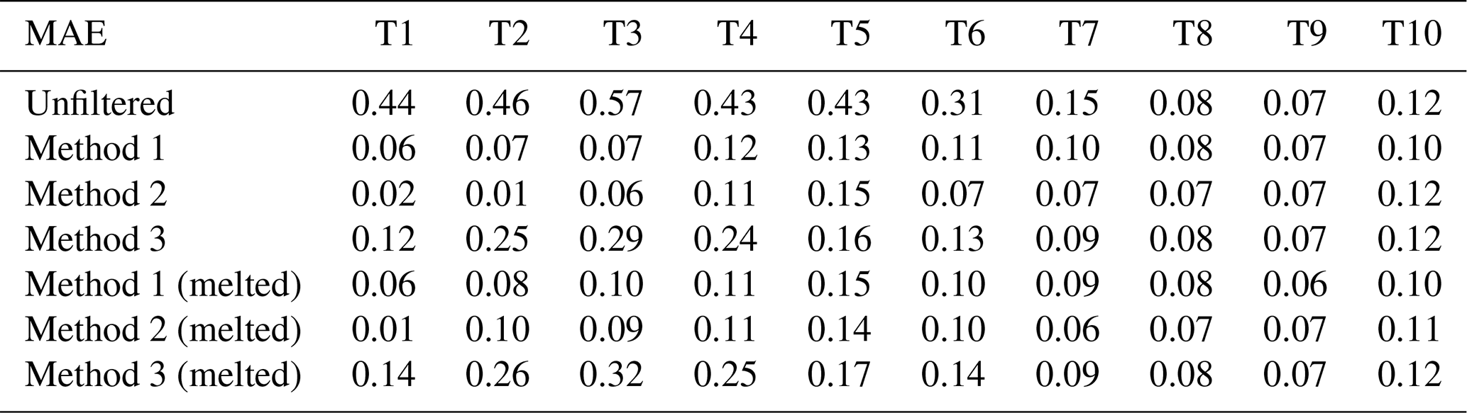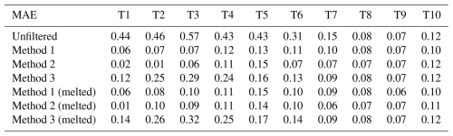 The CC decreases substantially in the Tw range, whereas a0 increases considerably (Fig. 11f). The RMSE and MAE were recorded at low values of less than 0.3 and 0.2 mm, respectively, when Tw was at or above 2 °C; however, these errors increased as Tw decreased to 1 °C or lower, with the magnitude of errors following the order of Unfiltered, Method 3, Method 1, and Method 2, which corresponds to the increasing trend of a1. In the range of 0 to 2 °C, the errors associated with results validated by the tipping-bucket rain gauge were greater than those from the weighing rain gauge (Fig. 11c and d). The MAPE exhibited its lowest error rate, below 20 %, at temperatures between 3 and 4 °C. It progressively increased with a decrease in Tw, ultimately reaching values of approximately 30 % or more at temperatures of 2 °C or lower.