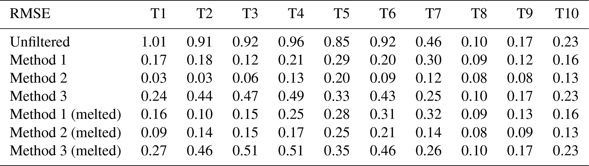 Table A9RMSE of precipitation intensity derived from weighing rain gauge and 2DVD observations for each Tw range.