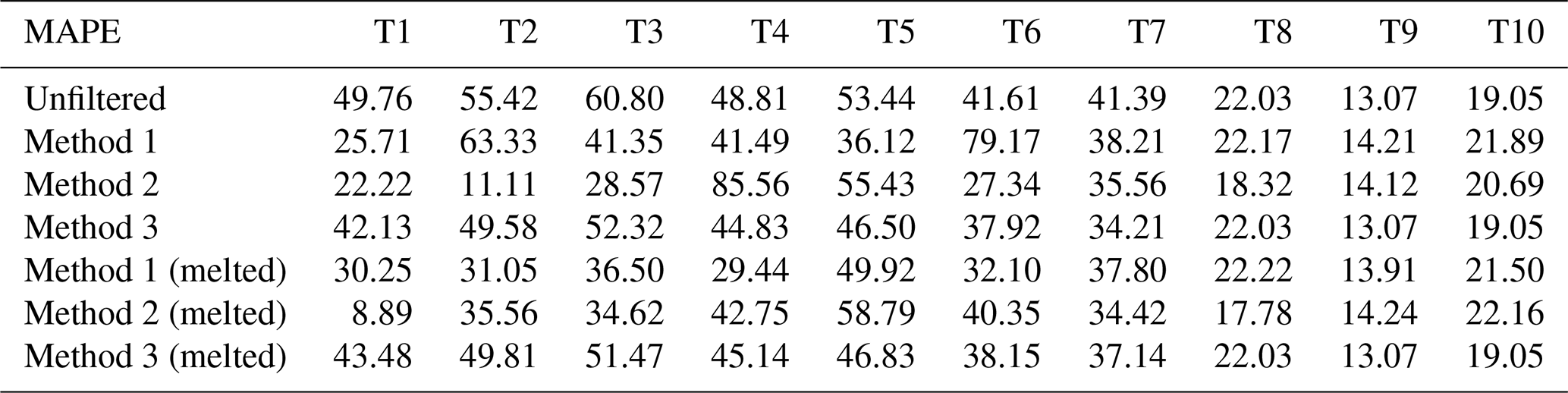Table A11MAPE of precipitation intensity derived from weighing rain gauge and 2DVD observations for each Tw range.