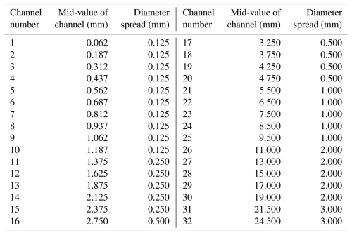 The 2DVD data can be configured to correspond to user-defined diameter bin sizes, which in turn influence the characteristics of the DSD output and the precision of the DSD model parameters (Marzuki et al., 2010). Consequently, this study aims to facilitate the analysis of PARSIVEL and 2DVD data for comparative purposes. To achieve this, 2DVD data were processed using the diameter channel information derived from the PARSIVEL data to compute the rain rate, number concentration, and DSD model parameters. Detailed information regarding the diameter and velocity channels of the PARSIVEL data is provided in the appendices (Tables A13 and A14). The rain rate (R, mm h−1) is calculated using Eq. (8), which incorporates the number concentration and fall velocity for each diameter. In determining the DSD model parameters after the rain rate calculation, data from intervals where the rain rate was 0.1 mm h−1 or greater were considered, thereby minimizing the uncertainty associated with the DSD model. The gamma model, recognized for its reliability in representing DSD characteristics, was selected for analysis. The gamma model is a widely used DSD model that enables the derivation of rainfall characteristics by capturing both the flatness and the overall shape of the number concentration distribution. This model (Eq. 9) is characterized by the shape parameter μ (Eq. 10), slope parameter Λ (mm−1) (Eq. 11), and intercept parameter N0 () (Eq. 12).