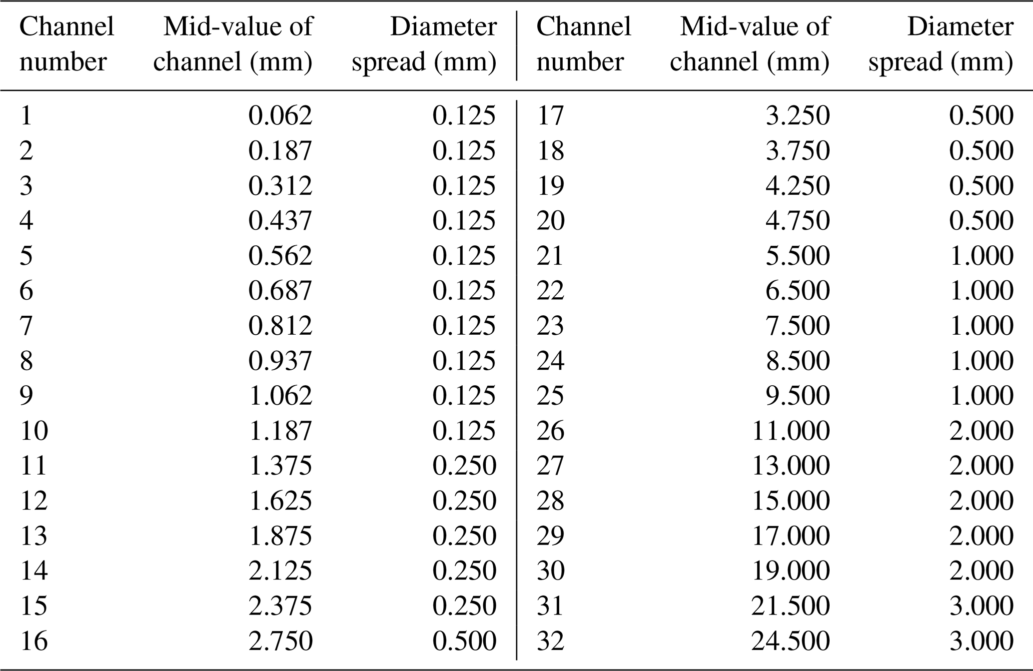 where D (in mm) is the diameter of the drop (or particle). This study involved a comparative analysis of the outcomes derived from the three QC methods based on fall velocity. Terminal velocity was determined using the equation established by Atlas et al. (1973) (Eq. 5).