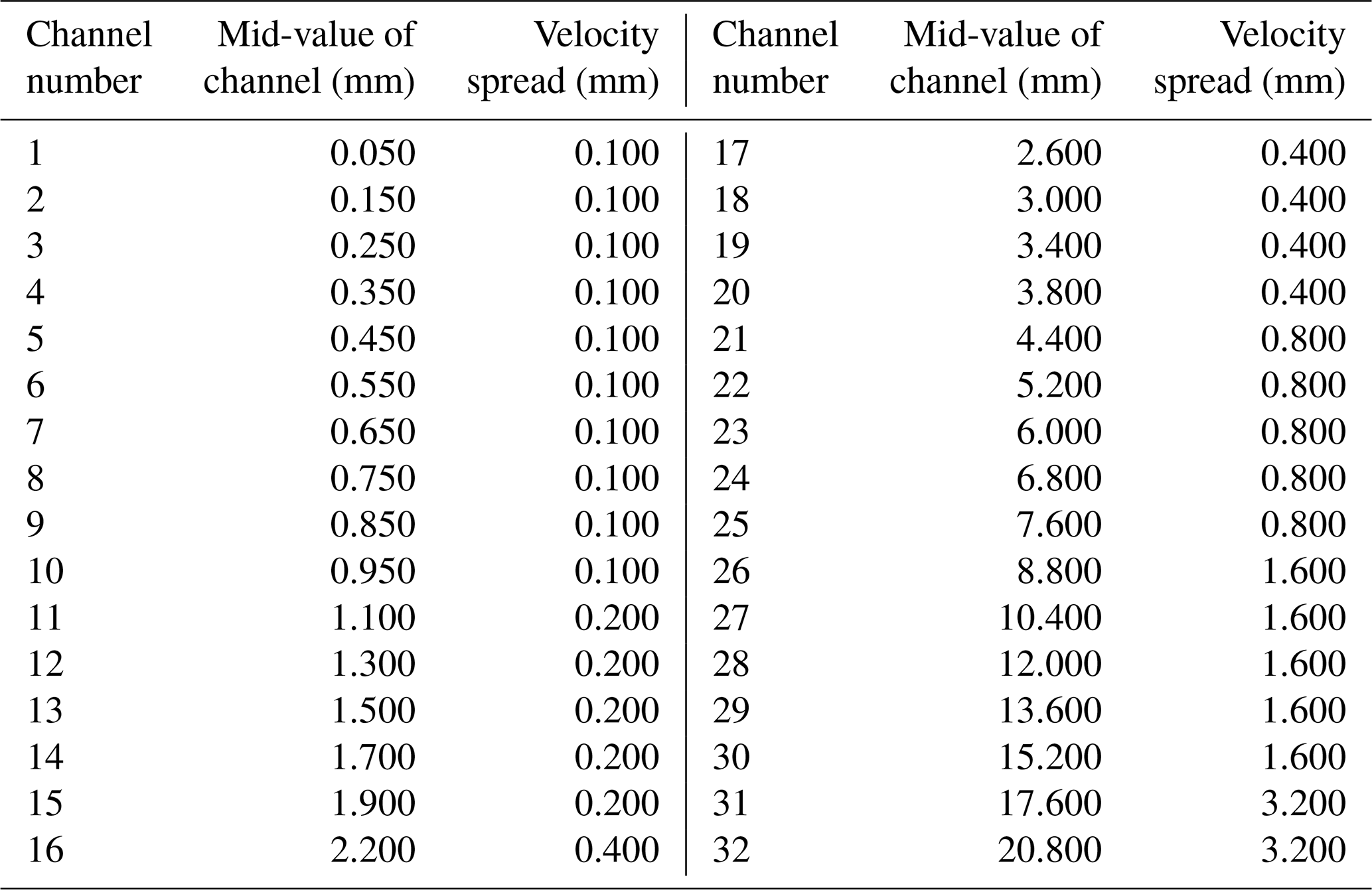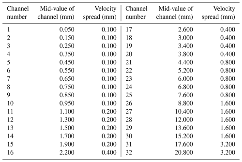 Raupach and Berne (2015) used data from a 2DVD instrument to derive correction factors for the drop-diameter channel in the PARSIVEL dataset. The fall velocity filtering technique employed for the 2DVD and PARSIVEL data involved the exclusion of particles exhibiting a terminal velocity exceeding 4 m s−1, as shown in Eq. (2), those with a fall velocity below 3 m s−1, as indicated in Eq. (3), and those larger than 7.5 mm, as shown in Eq. (4).